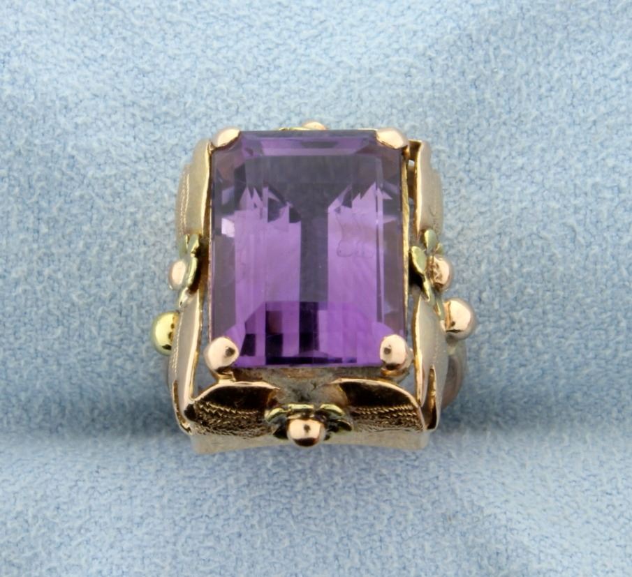 This ring is 18K rose & yellow gold, it contains a 7ct emerald cut amethyst with great color & clarity. Very unique floral design on shank. Size 5 7.0g