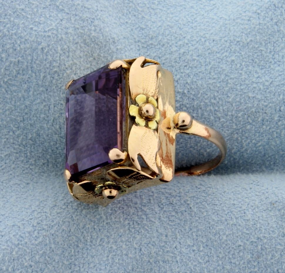 This ring is 18K rose & yellow gold, it contains a 7ct emerald cut amethyst with great color & clarity. Very unique floral design on shank. Size 5 7.0g