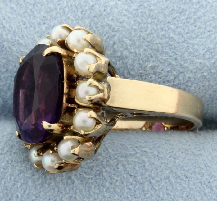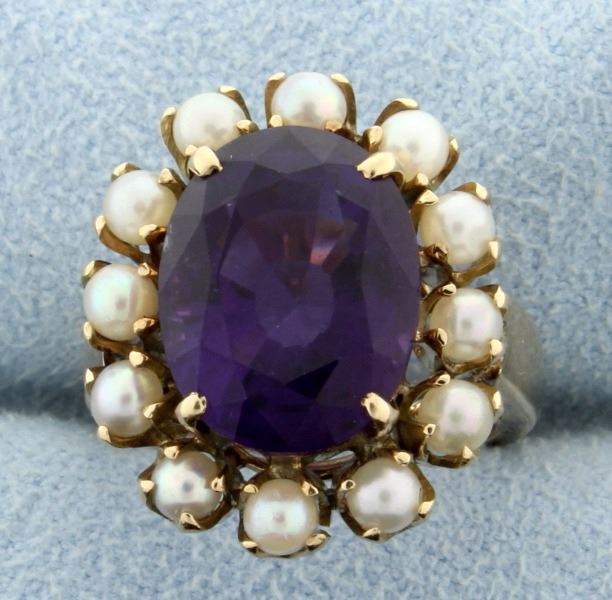 In 14K yellow gold there is a 13x10mm oval amethyst approx. 5 ct. And 12 seed pearls, 3mm each. Size 4 6.8g