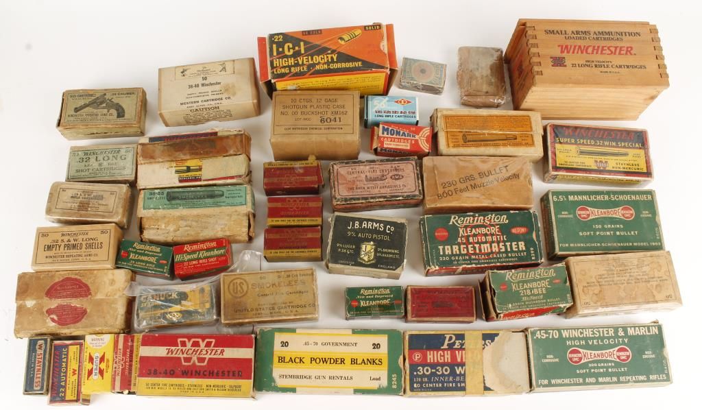 Many are partial or full boxes, some sealed, of various ages, conditions, and caliber's; includes a Winchester Super speed .32 Win full box.
