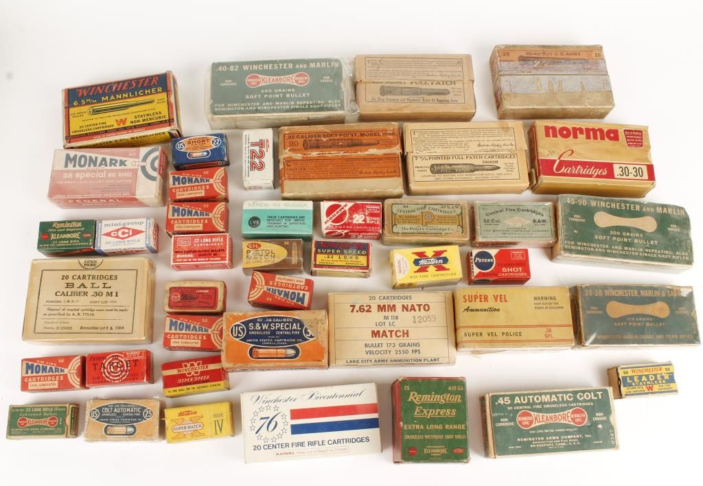 Many are partial or full boxes, some sealed, various ages, conditions, and caliber's includes a Winchester Bicentennial .30-30 full box.