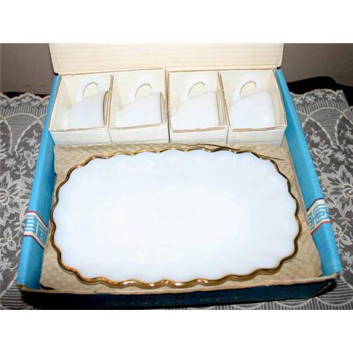 These are Vintage Milk Glass Snack Sets-- never been used-- trimmed with 22K Gold Edging, complete with their original box! Each box contains 8 pieces, 4 Cups and 4 Trays or, a Set of four. They appear to have never been used. Each Tray measures 6 1/2 inches by 10 3/8 inches, with the Cups measure 2 1/4 inches tall by 3 1/4 inches wide. All Milk Glass is shinny, with each Tray trimmed in 22K Gold! Very elegant and functional at the same time. These would be perfect for the new bride-to-be; she could use them for her bridal luncheon which would make them a Keepsake! We currently have two complete sets.Priced and sold individually. In MINT condition.