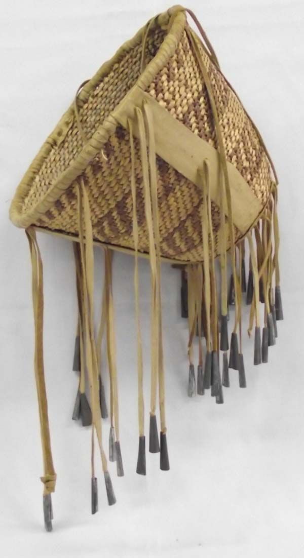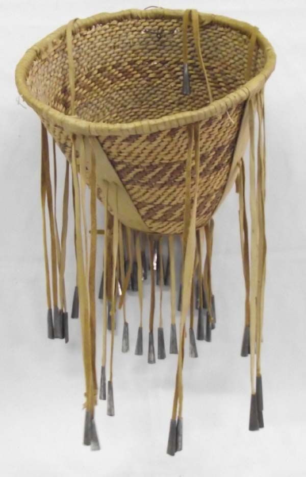 Vintage Apache Burden Basket with Jingles, measures approx. 9.5''L x 12'' W, not including the jingles. Basket is Two Toned. Native American Apache Burden Basket, The burden basket of the Apache Tribe is one of the most quickly recognized items of material culture of the people, They are used for the young girls puberty ceremony, or sunrise dance, as many call it today, usually made of yucca root, devil's claw, and sometimes cottonwood, it has a flattened buckskin covered bottom, leather fringe with tin cone jingles