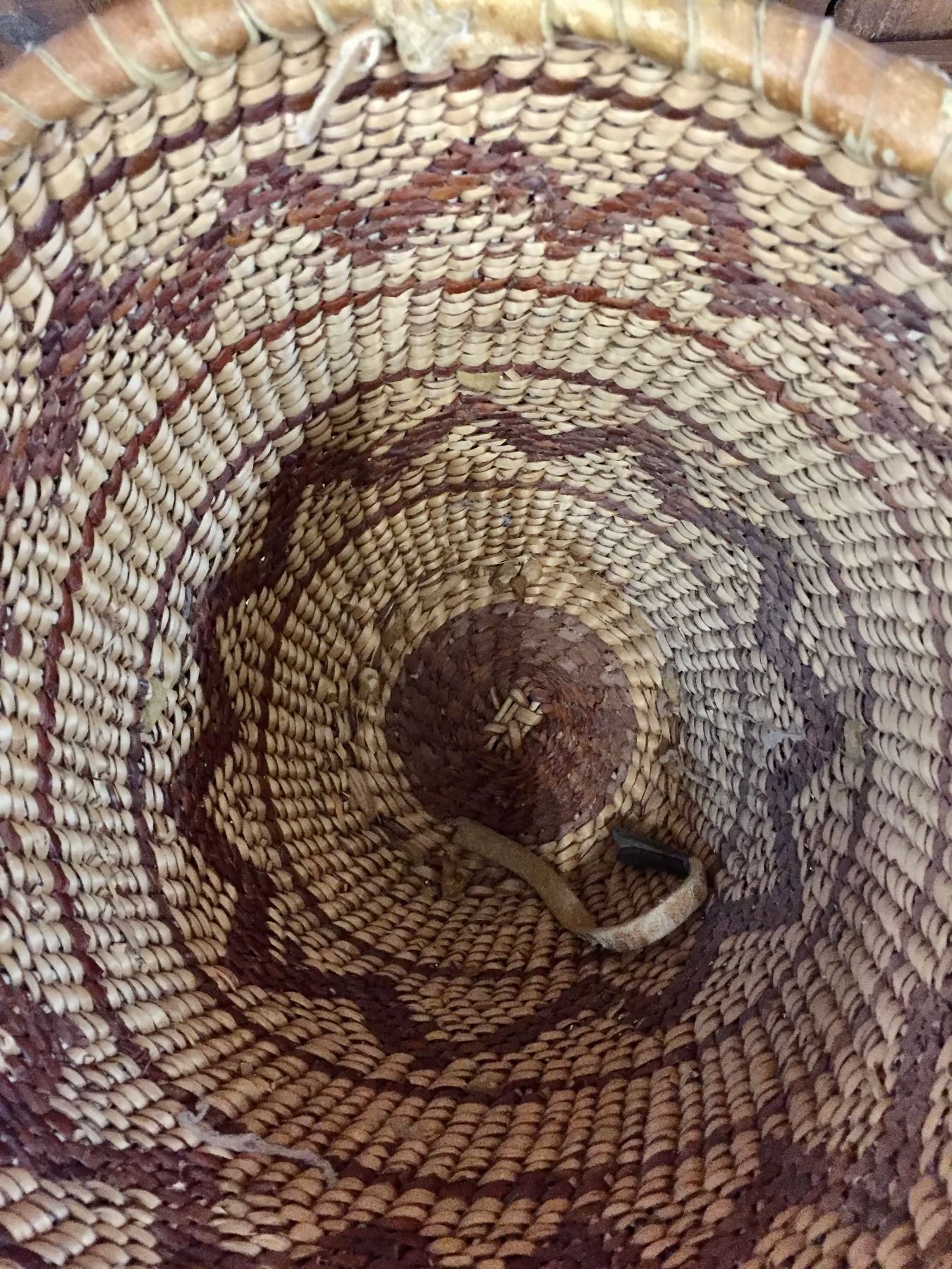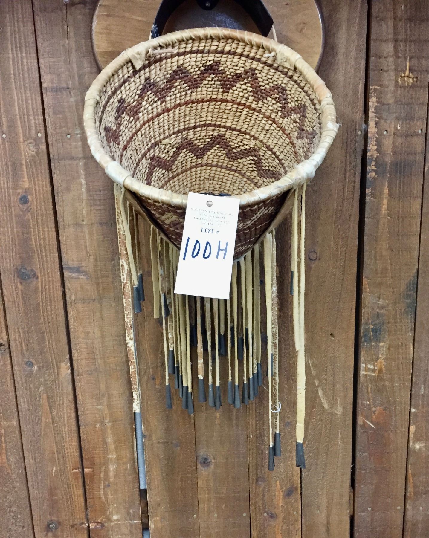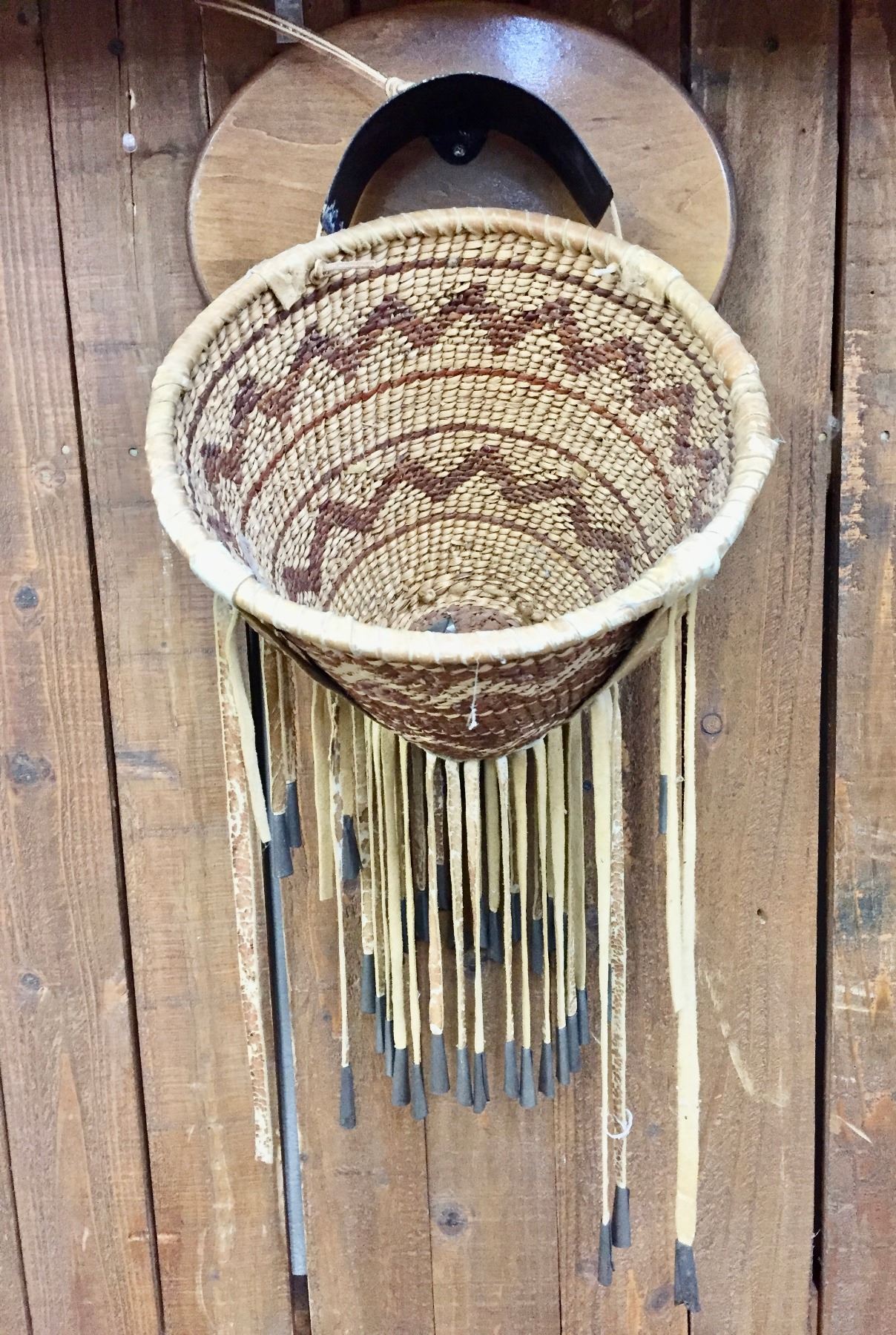 Description: For your consideration we offer for sale this vintage Apache Burden Basket featuring nice designs and leather accents. Maker: Unknown Apache Artist. Approx. Age: Circa 1960s. Size: 11” round x 8-1/2” deep. Condition: Good for its age, normal wear expected. Please look closely at the pictures - they are an important part of our description. Shipping: There will be a $10 handling / packaging fee for shipping this lot. The actual cost of postage will be added on top of that.