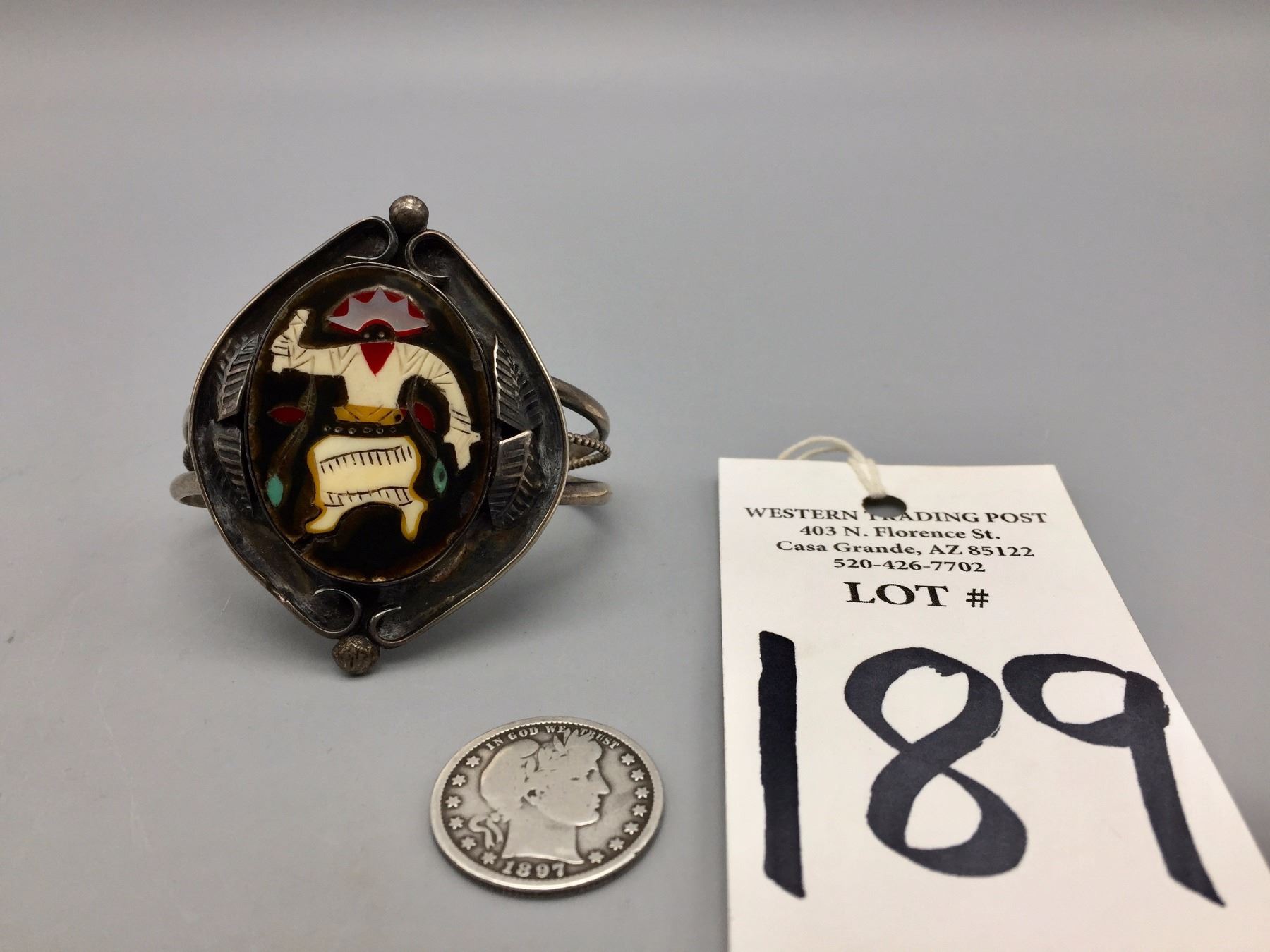 Description: Vintage Apache Mountain Dancer bracelet. Maker: Unknown, looks like vintage Zuni inlay work. Approx. Age: Vintage, circa 1970s. Size: Inside circumference measures approx. 4 1/4“ with a 1 1/2” gap (making this bracelet fit about a 5 3/4” wrist). It is 2 1/4” wide across the face and weighs 30.4 g. Condition: Good for its age, normal wear expected. Please look closely at the pictures - they are an important part of our description. Shipping: There will be a $5 handling / packaging fee for shipping this lot. The actual cost of postage will be added on top of that.