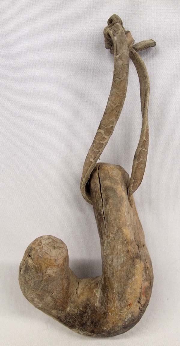 Vintage Native American Apache Wooden Saddle Hook, measures 4.75'' x 3.5'', strung on weathered leather