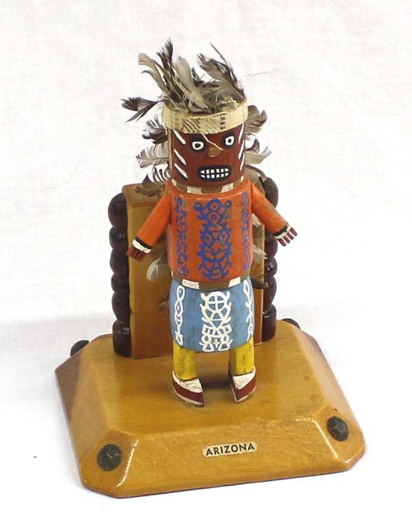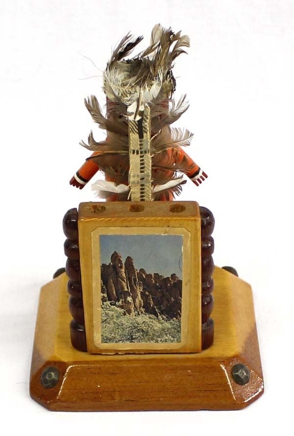 Vintage Native American Arizona Tourist Trading Post Kachina Pencil/Pen Holder, measures 7''H x 5''W x 5''Deep, embellished with cloth and feathers, missing nose