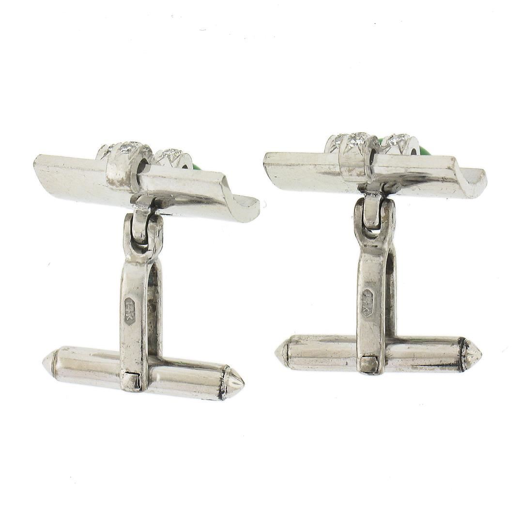 A vintage solid 14k white gold cufflinks by Astor, with 2 oval cabochon cut natural jades (8.3x6.9mm each). and 16 old single cut natural diamonds (G-H - VS2-SI1 ; 0.32ctw). These cuff links have a swivel design with a clearance of 12.8mm, weigh a total of 17.17 grams, and the front panels measure 16.9x18.2mm.