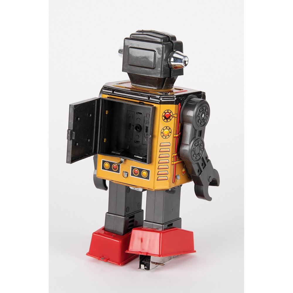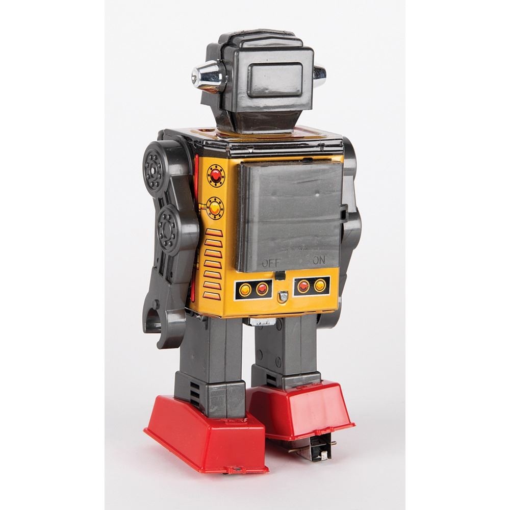 Classic circa 1960s–70s battery-operated "Attacking Martian" walking tin toy robot, made in Japan by Horikawa, standing 9.5˝ tall. The robot has a black-and-bronze body with red plastic feet, with open chest boasting two pop-out blinking guns. Includes its original box, advertising the toy's automatic actions: "Stop'n go," "Blinking and pop out shooting gun," and "Realistic shooting noise."