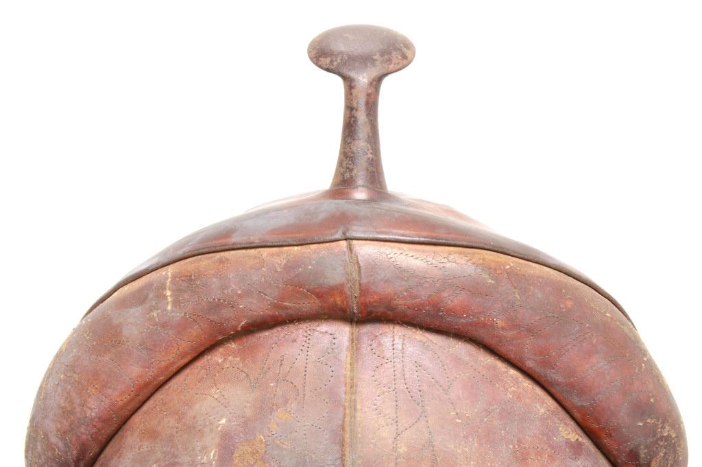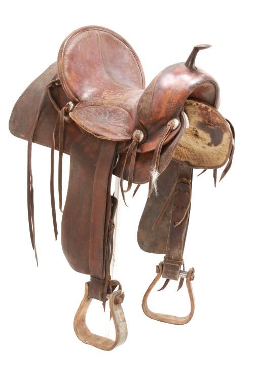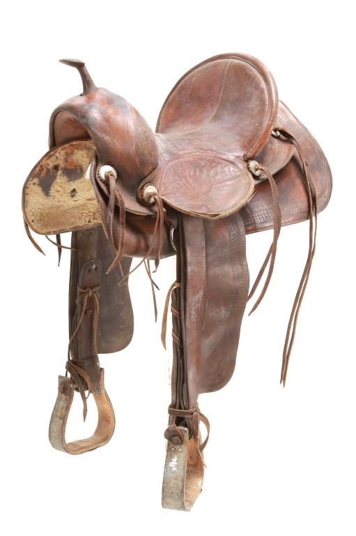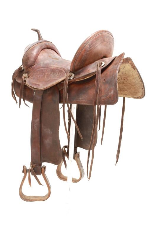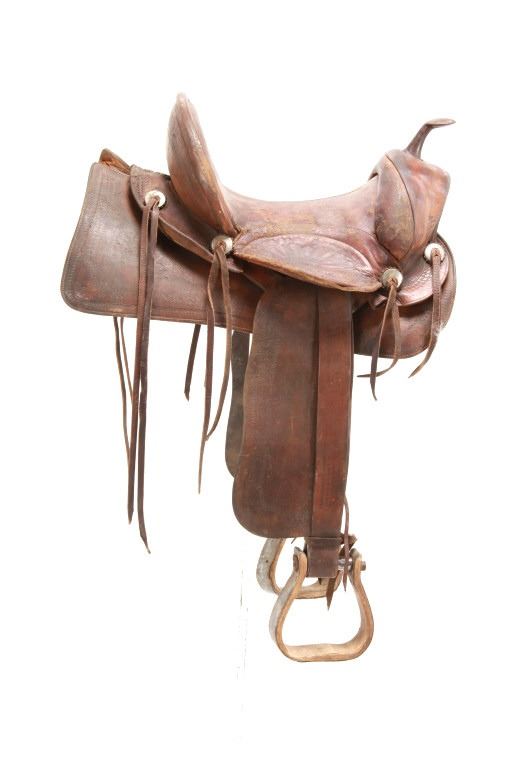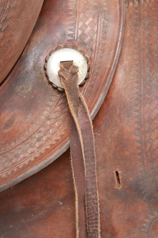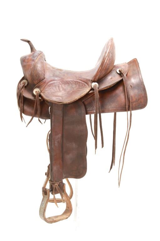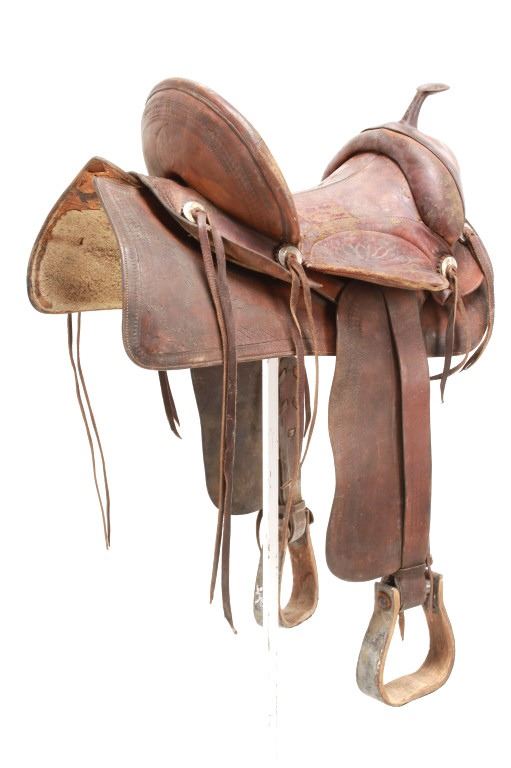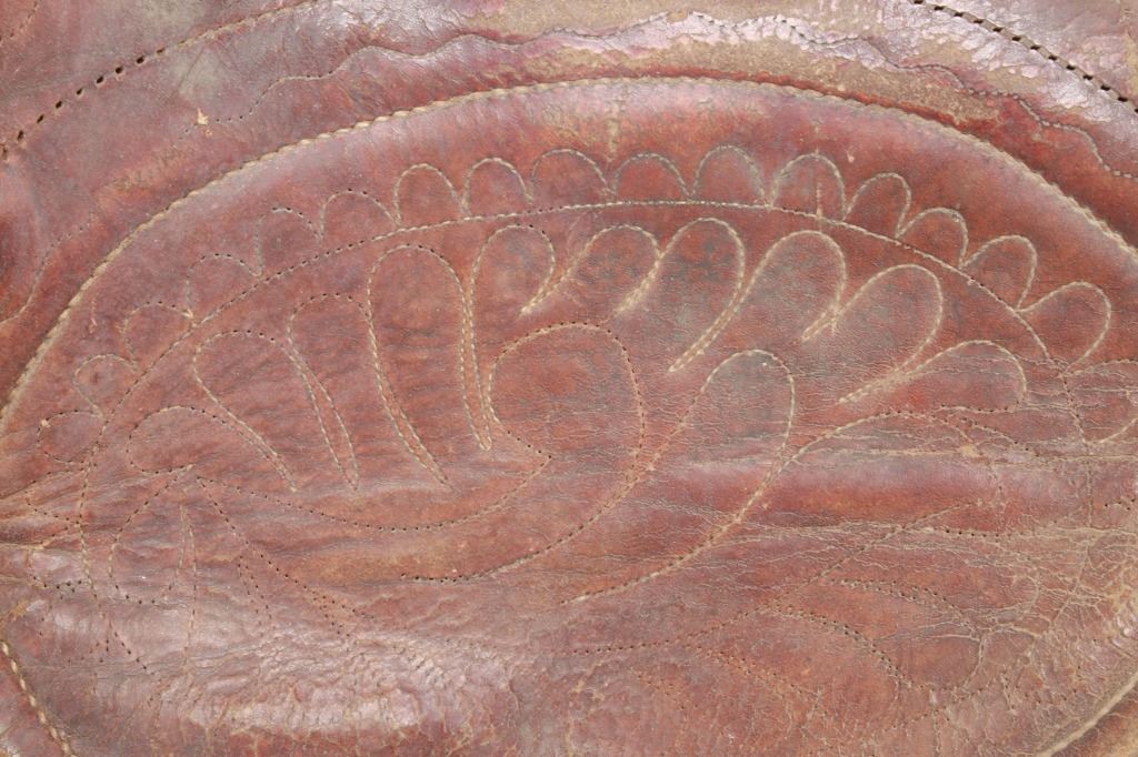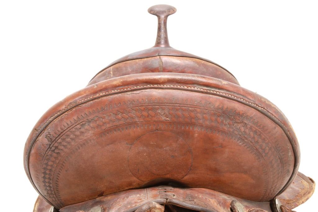 Featured in this lot is this vintage Australian closed swell saddle, circa 1940's. The saddle shows a wonderfully and professionally crafted saddle with tooling and stamping that accentuates the beauty of this saddle. The maker’s mark is shown on the back of the set, but is worn down to be unrecognizable. The condition of this saddle is good, with wear to the fleece lining and to the outer leather work on this saddle. The measurements of this saddle are 30 3/4" x 17" x 23".
