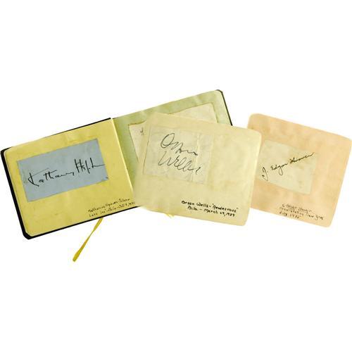 <B>Vintage Wartime Autograph Book.</B></I> A 6" x 4.5" faux black leather autograph album with 12 great signatures on pieces of paper pasted to the pages, dated from March 29, 1939 to July 1945. Included are Orson Welles, Katharine Hepburn, Laird Cregar, George Arliss, Lt. Gen. Jimmy Doolittle, and J. Edgar Hoover. In Fine to very Fine condition with mild cover wear and mild to moderate wear and/or discoloration to the pages, the signatures largely unaffected.<I>Accompanied by LOA from PSA/DNA.</B></I><BR><BR><b>Shipping:</b> Books & Catalogs (<a target="_blank" href="http://www.heritageauctions.com/common/shipping.php">view shipping information</a>) <BR><BR><B>Important notice:</