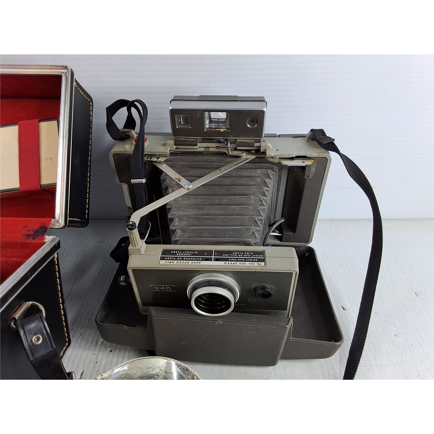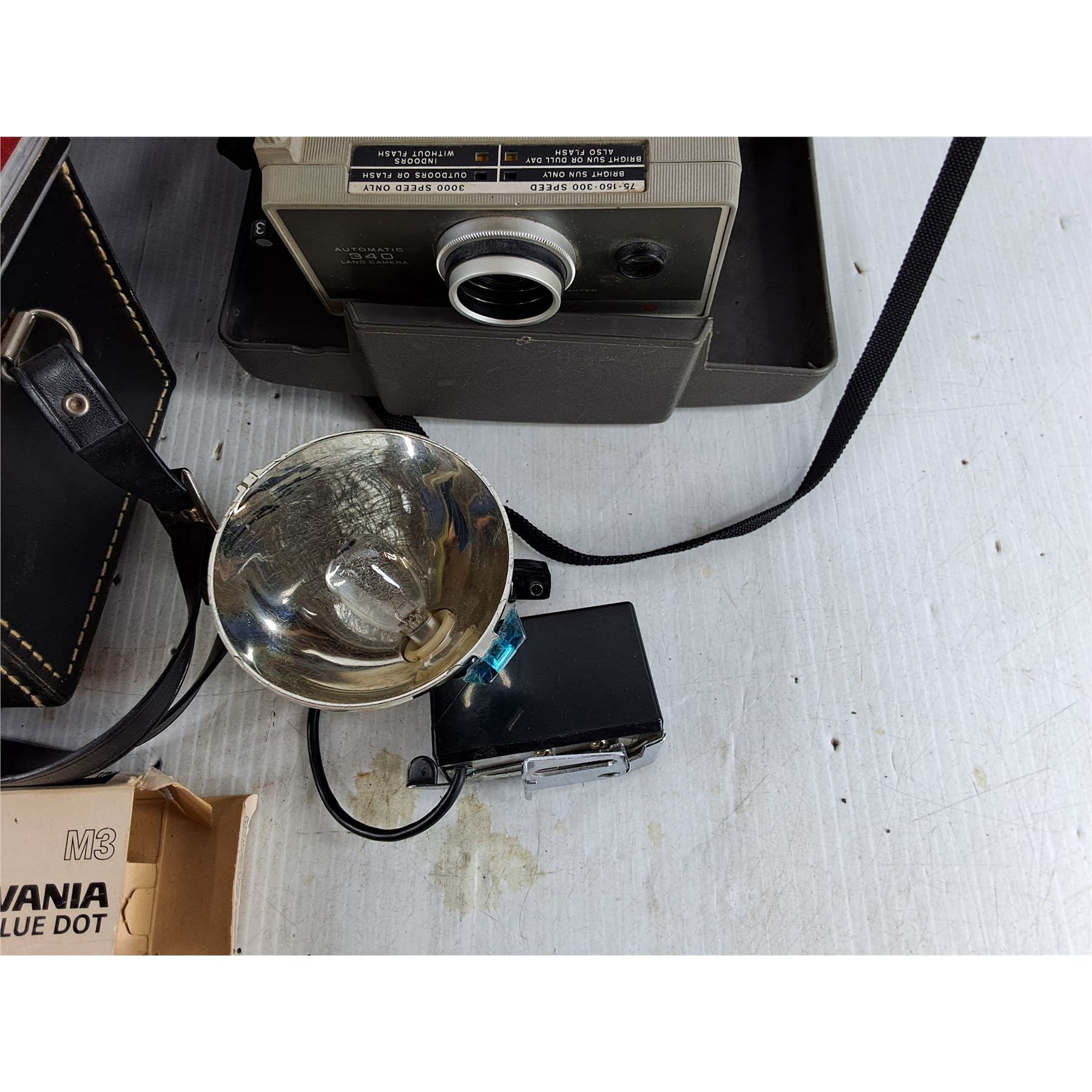 Vintage Automatic 340 Land Camera, Flashlight, Sylvania Flashbulbs, Camera Case - As Is