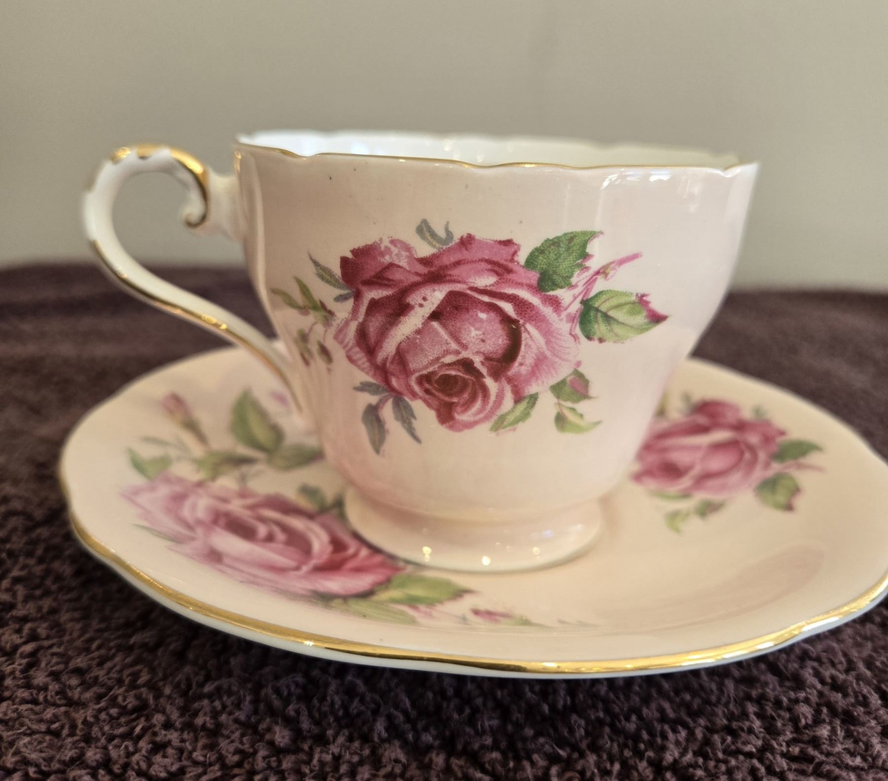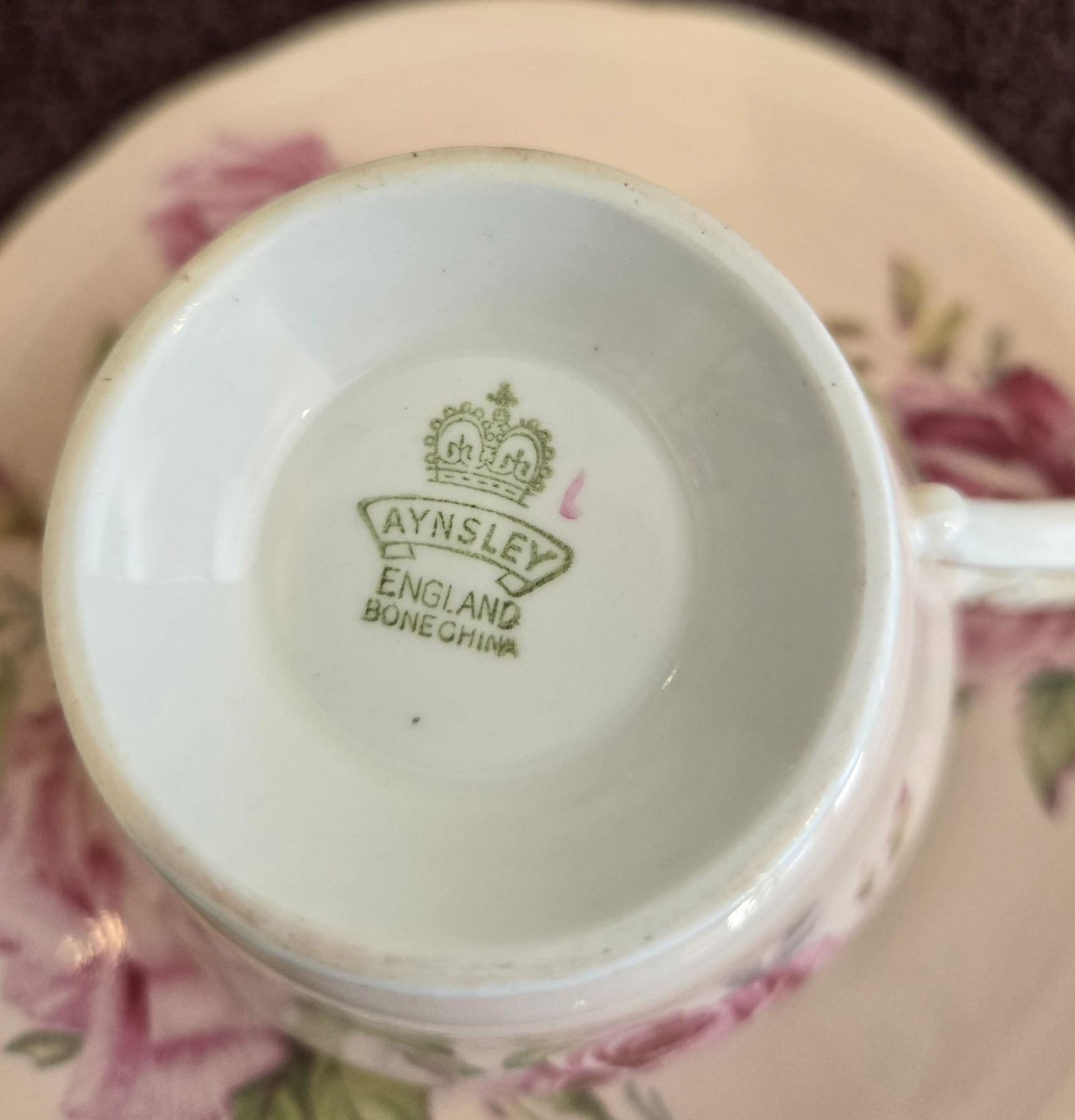 Vintage Aynsley bone china teacup and saucer set. Ping cabbage rose pattern with gold trim. Peach color background