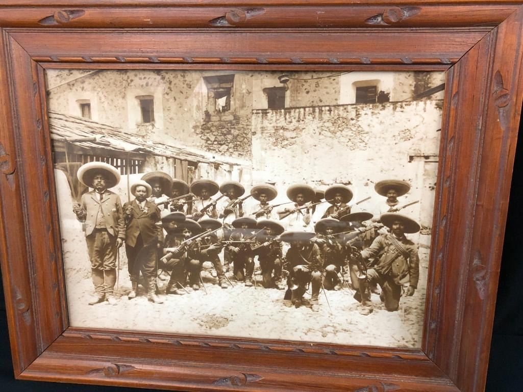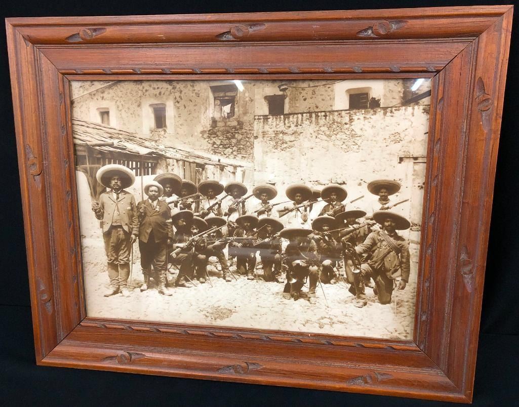 For sale in this lot is an old black and white photo in a wood frame and under glass. The scene features a group of soldiers and they appear to be from the Mexican Revolution. This is an original blown up to a larger size and is not a modern laser jet print (no dot matrix is present under magnification). MAKER: Unknown. APPROX AGE: Vintage. SIZE: 26 inches wide x 21 inches tall with frame. CONDITION: Pretty good for its age, normal wear expected. Please look closely at the pictures as they are an important part of our description and are hereby incorporated into the description, specifically with regards to condition. SHIPPING: There will be a $20 handling / packaging fee for shipping this lot. The actual cost of postage will be added on top of that. BUY IT NOW: If you would like to buy this item now, without waiting for the auction day to bid on it, we do offer this option (which is available up to 48 hours before the actual auction starts). The “Buy it Now†price is the high estimate of this lot (plus applicable fees and the Buyer's premium is discounted to 10% when using the Buy it Now option). If you would like to exercise this option, you must contact us by email (or phone as long as you talk to someone live). Reference this lot number and your intention to "Buy it Now."