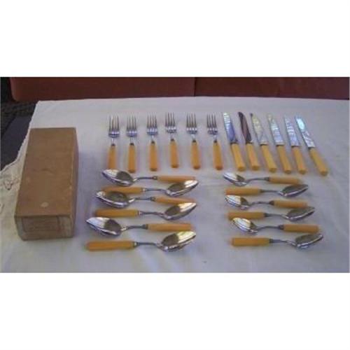 <tr><td>Title:Vintage BAKELITE Kitchenware Flatware Set</td></tr>