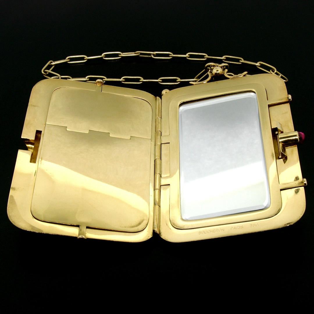 A vintage solid tri-color gold compact made by Boucheron with 5 round cabochon cut natural ruby accents. Comes with its original 10 inch wrist chain, 166.4 grams total weight.