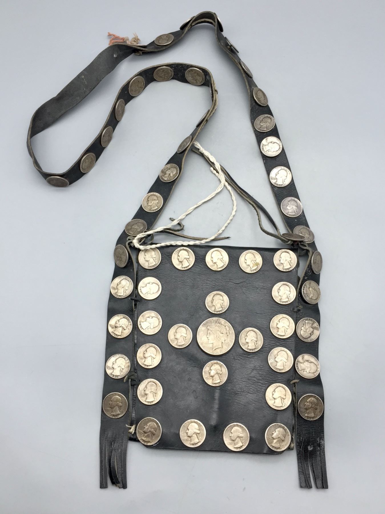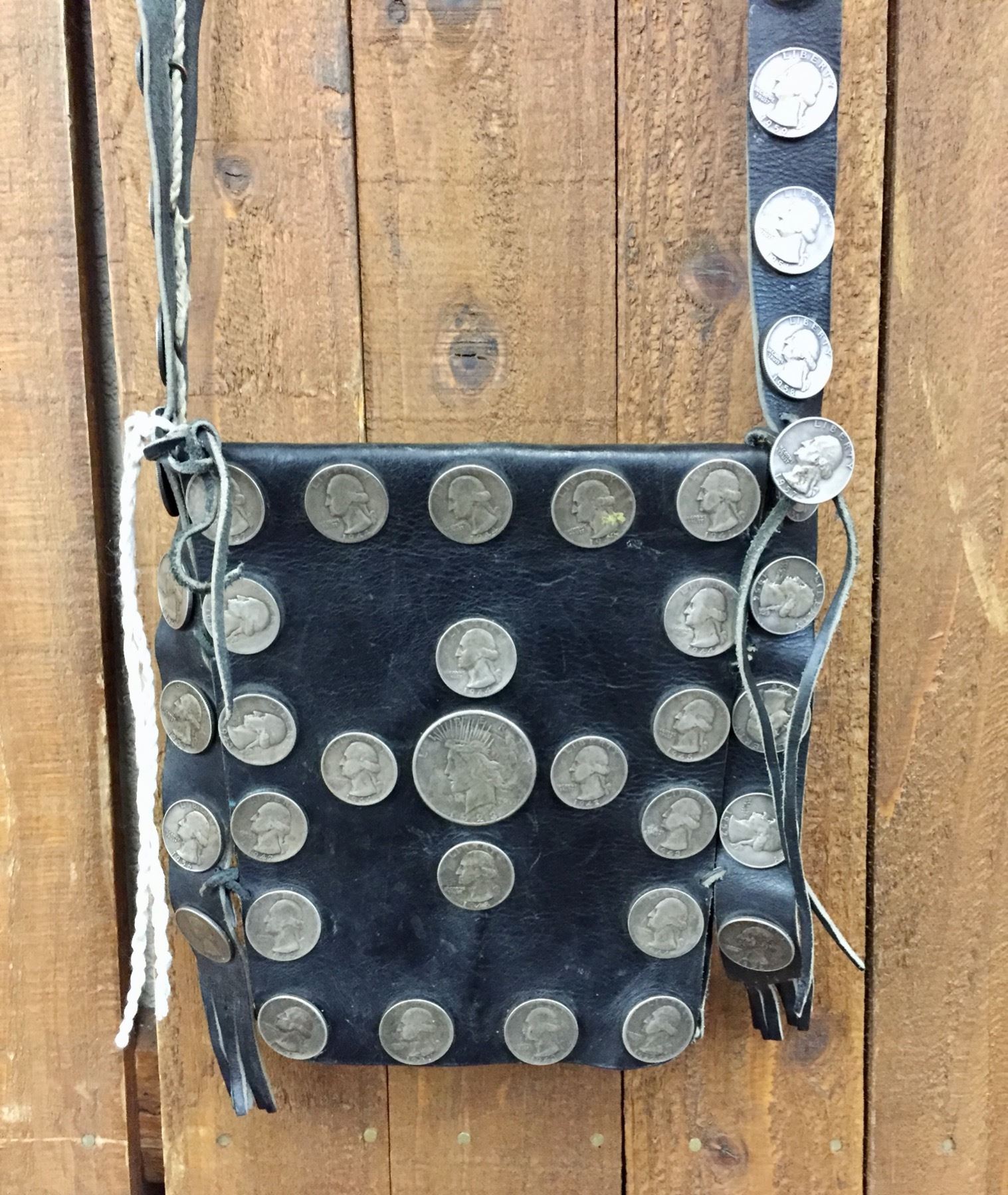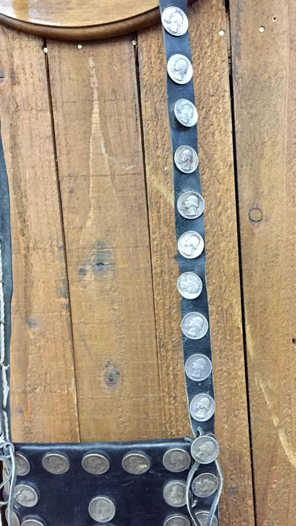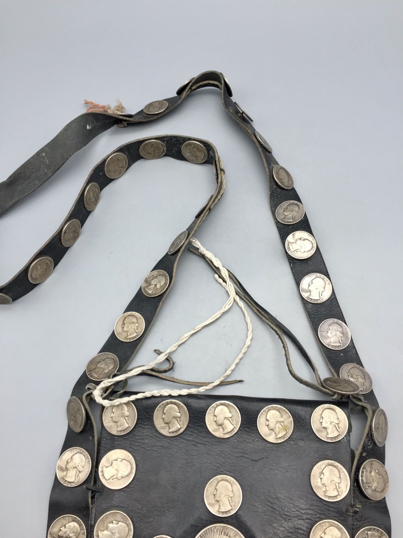 Description: Offered for sale in this lot is a great vintage bandolier bag with coin silver buttons as accents. Made with black leather. Has a nice look to it. Maker: Unknown. Approx. Age: Vintage. Size: 31†long X8-1/2†wide. Condition: Good for its age, normal wear expected. Please look closely at the pictures - they are an important part of our description. Shipping: There will be a $7 handling / packaging fee for shipping this lot. The actual cost of postage will be added on top of that.