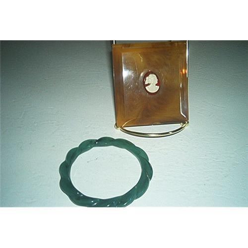 Jade colored bangle bakelite bracelet and a (2) mirrowed Compact by Trina. A Cameo is located on the top of the mirrowed lid and a gold sticker on the bottom with "T's" all around it. Inside are two mirrors, one is square and one is round. Absolutely beautiful. The compact measures 3 1/4 inches long by 3 inches wide. Both items are in excellent condition. No chips, cracks, etc.