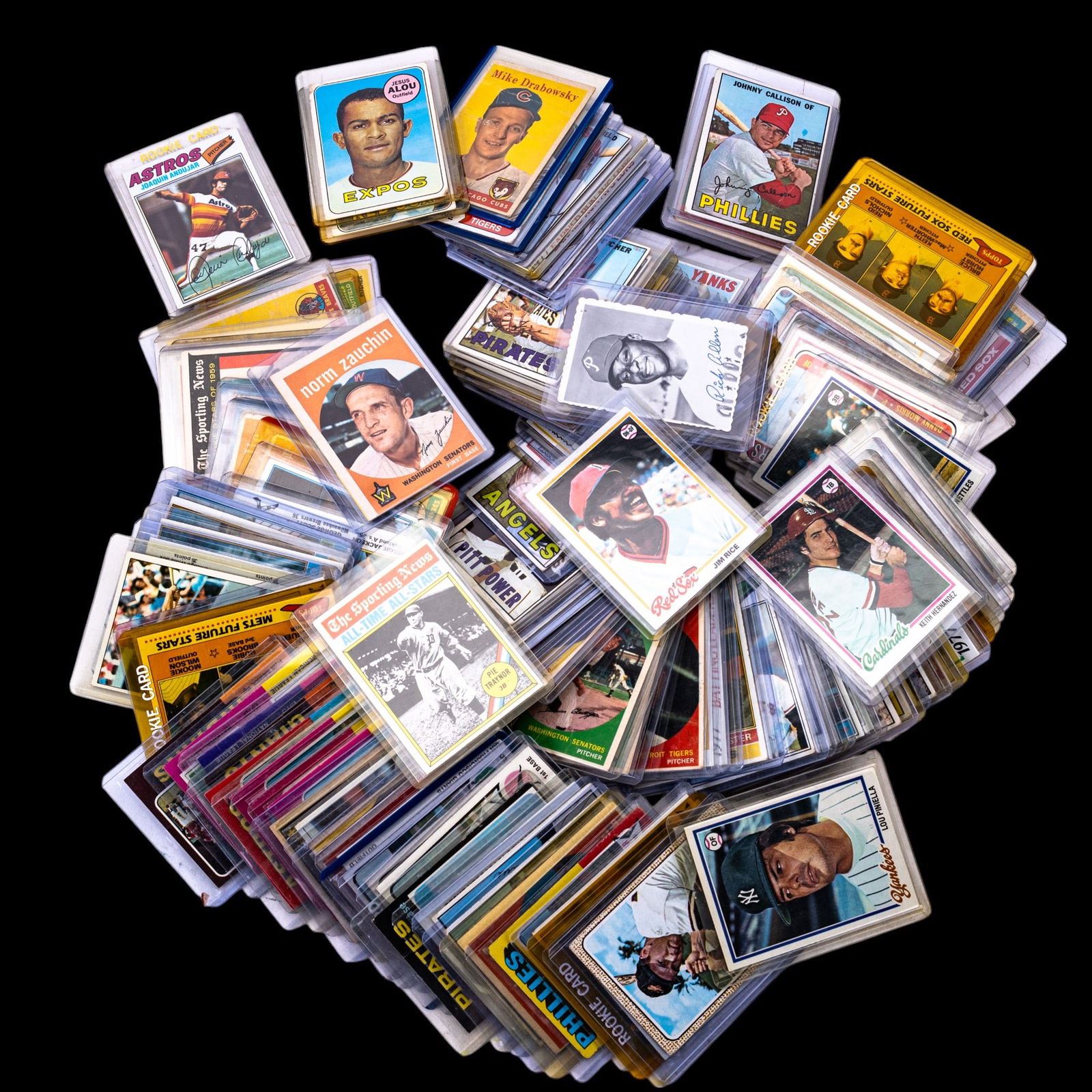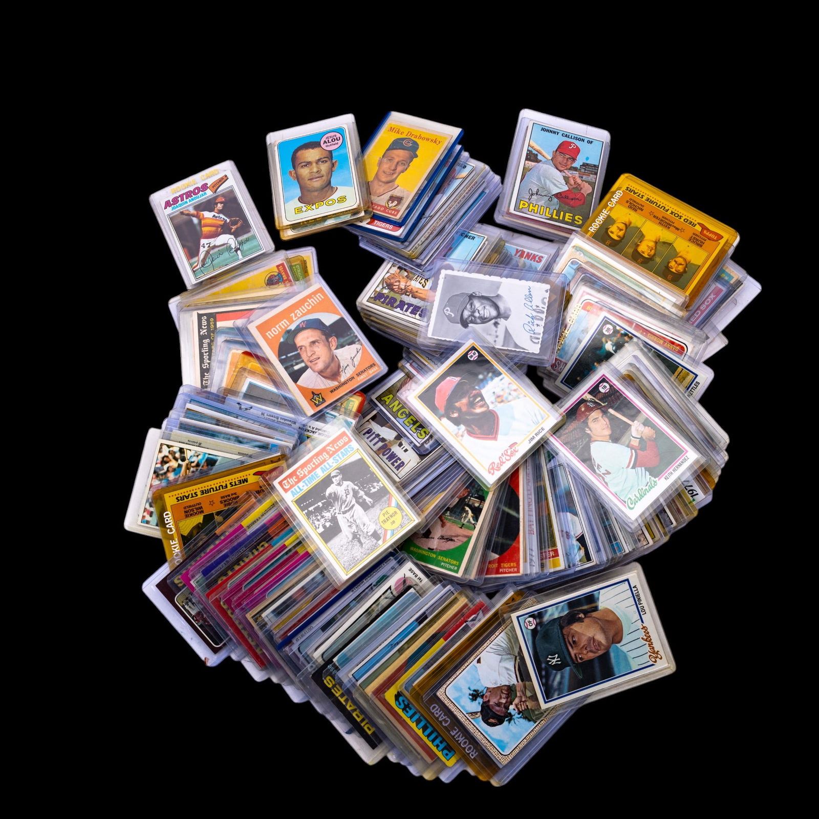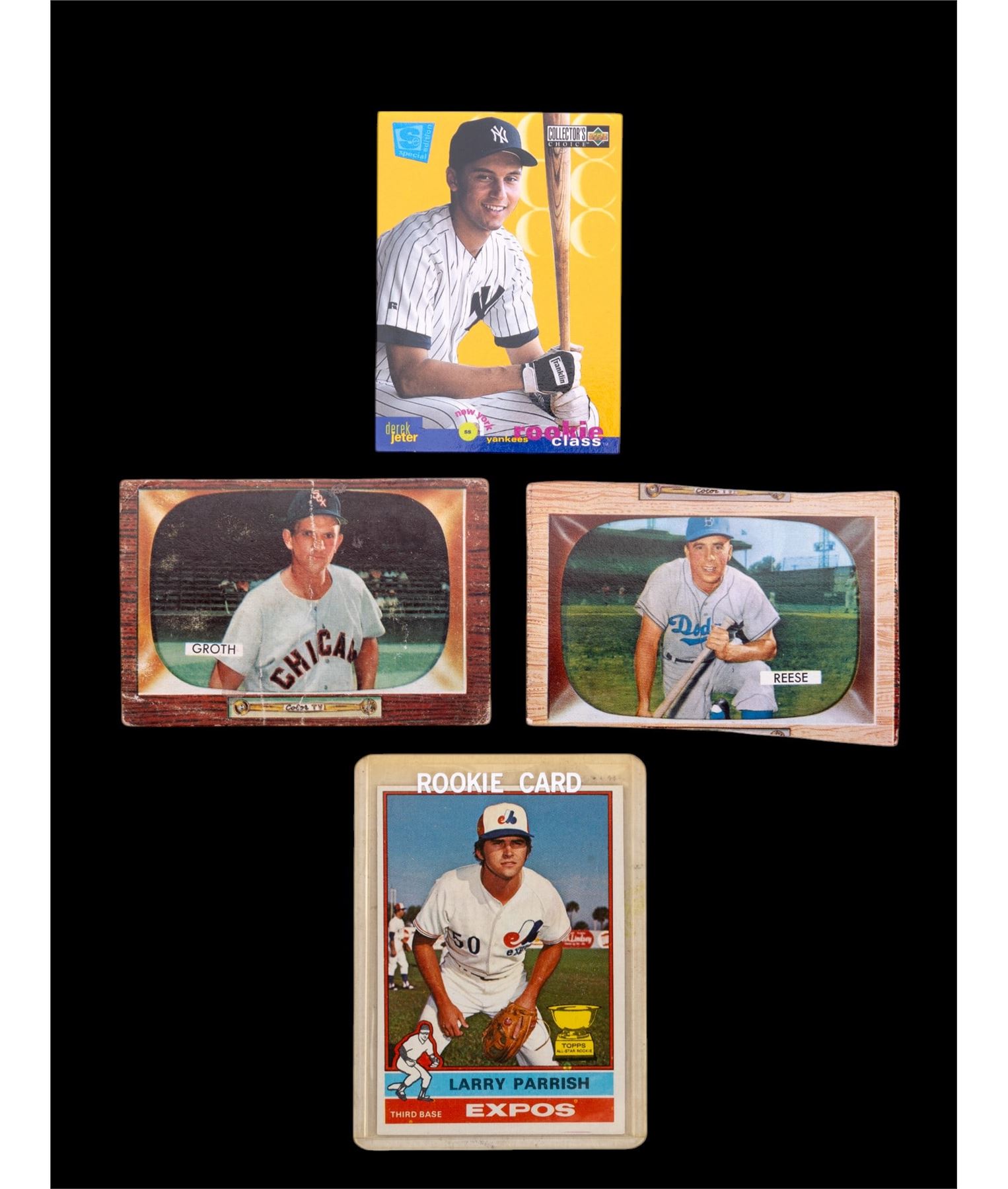 A collection of vintage Topps and Bowman baseball cards circa 1950s-70s, featuring Bobby Bonds, Tug McGraw, Brooks Robinson, Keith Hernandez, and more, one Derek Jeter Upper Deck Rookie Card from 1994.