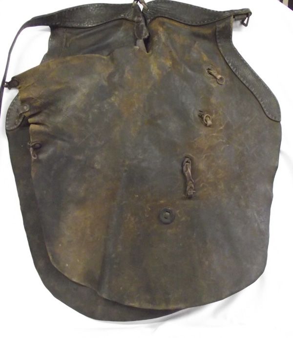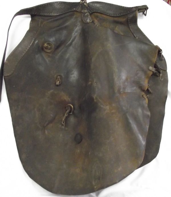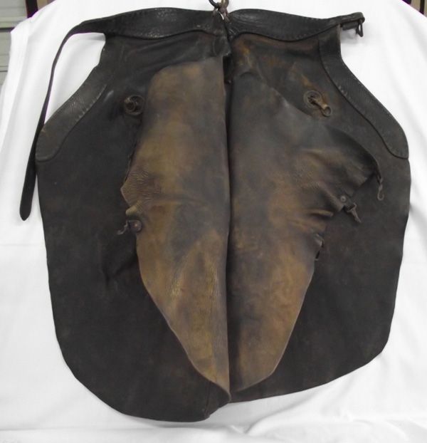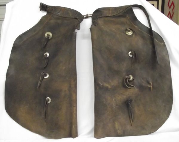 Vintage Bat Wing Chinks-Mesilla Valley, NM Origin. Handsome pair of bat wing chinks, heavy working man's leather. Original conchos with one missing and repaired with a leather substitute, all thong ties intact and original buckles.