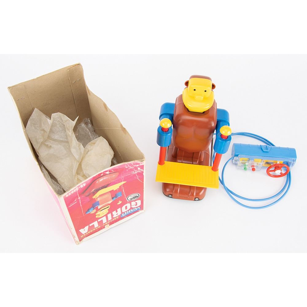 Vintage circa 1970s battery-operated "Gorilla" robot, made in Japan by Bandai to be sold exclusively by Montgomery Ward, standing 8Àù tall. The gorilla features a wired remote with steering wheel and two buttons, allowing for forward and reverse motion, turning left or right, mouth opening and closing, and tray moving up and down. Includes the original box cover.