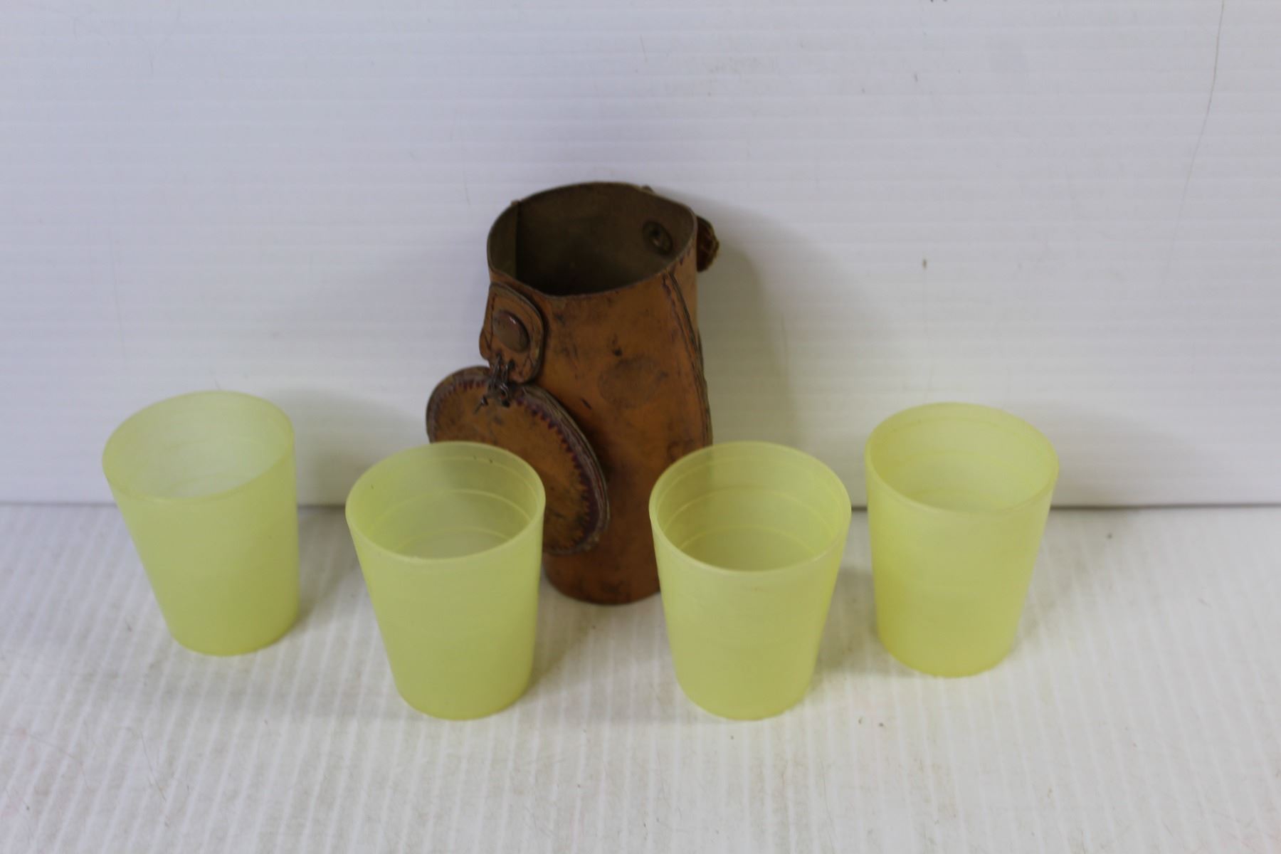 Vintage Beacon Clock (not working) - (3) Glass Insulators - Leather Case w/4 Plastic Shot Glass (Yorkton Sask - case has damage) - Misc. Items