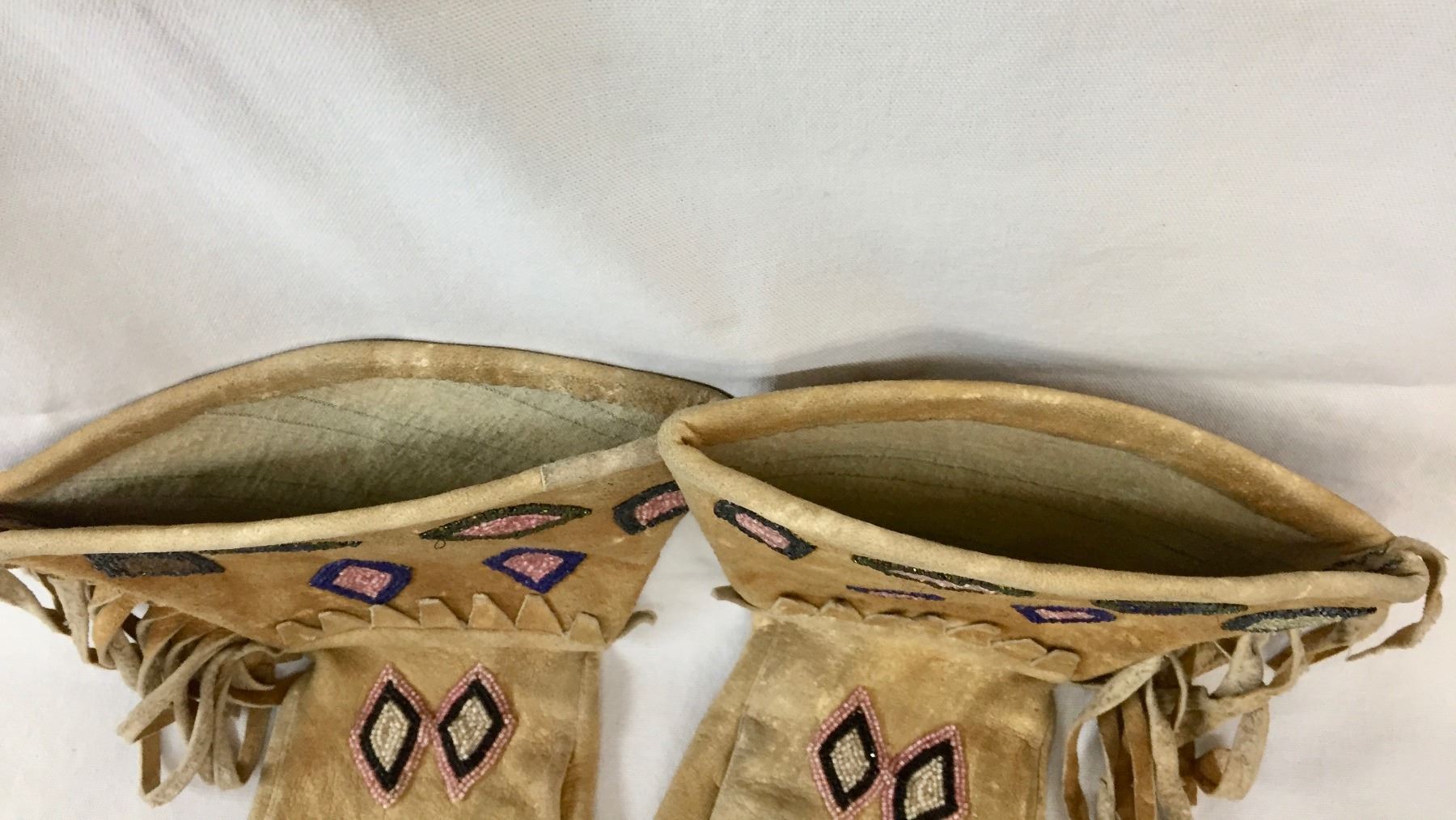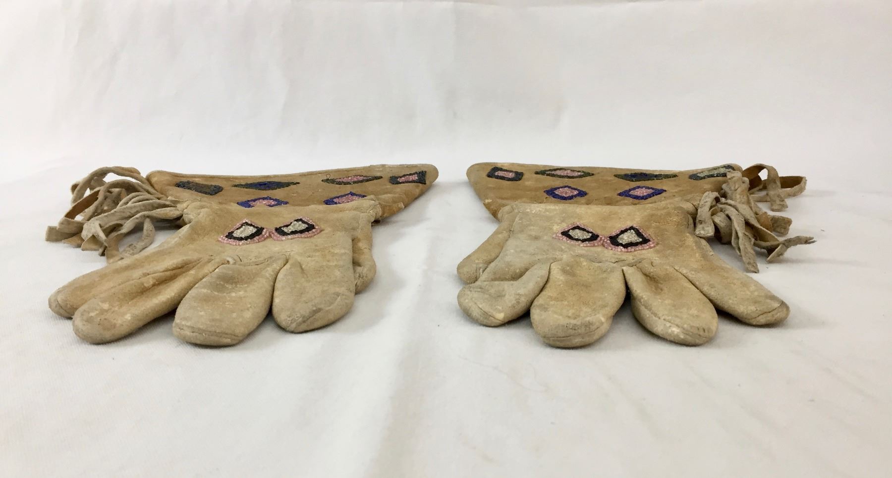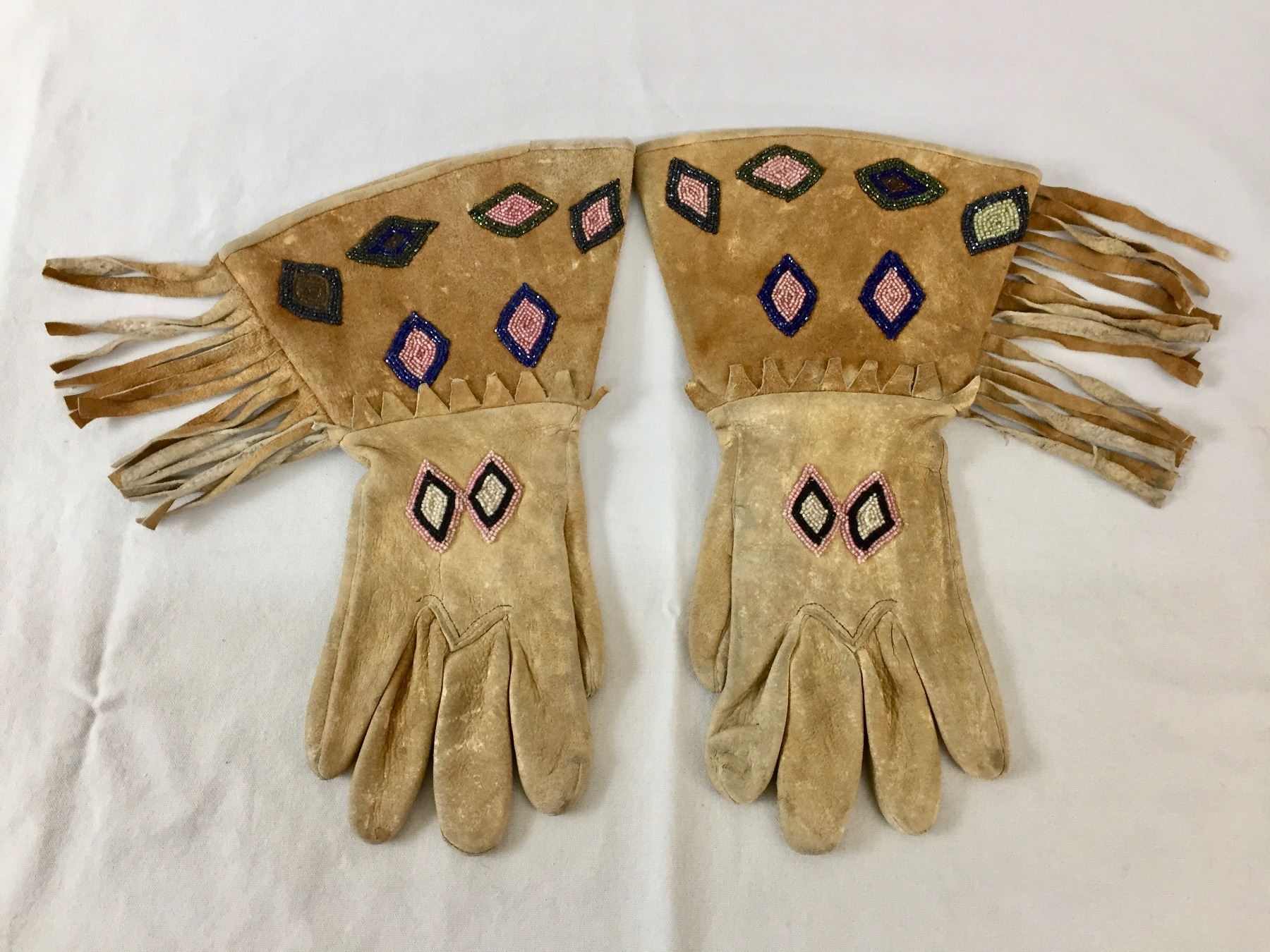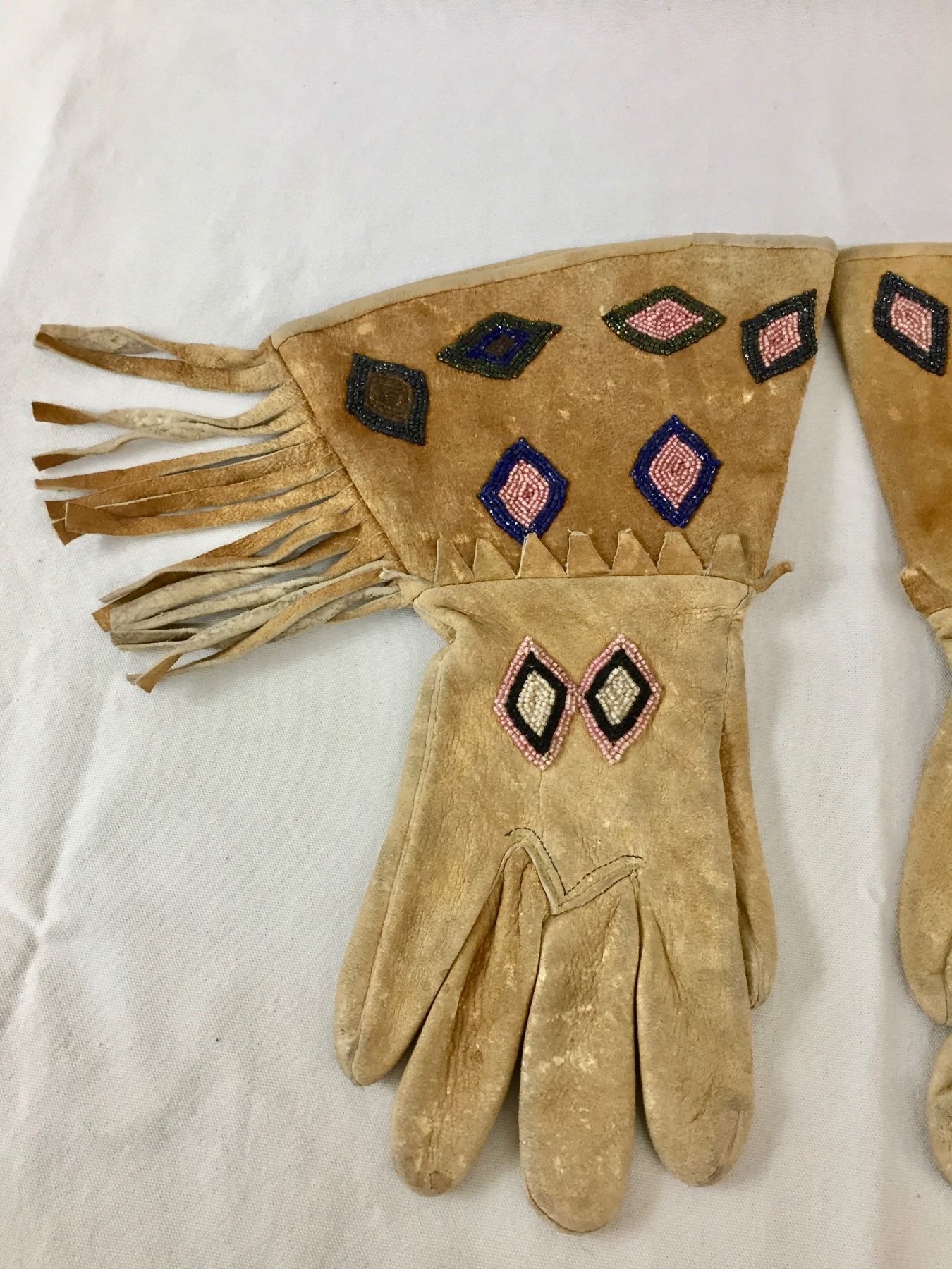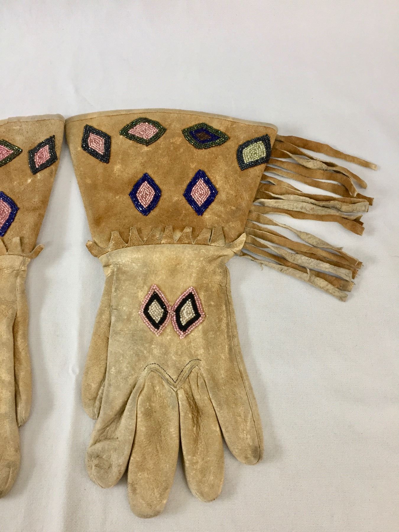 Description: Offered in this lot is a nice pair of vintage beaded gauntlets. These gauntlets feature leather fringe and are adorned with beadwork in diamond patterns. Maker: Unknown, but appears Plateau or upper Plains. Approx. Age: Circa early 1900s vintage. Size: Measures 8-1/2”w x 14” tall. Condition: Good for its age, normal wear expected. Please look closely at the pictures - they are an important part of our description. Shipping: There will be a $5 handling / packaging fee for shipping this lot. The actual cost of postage will be added on top of that.