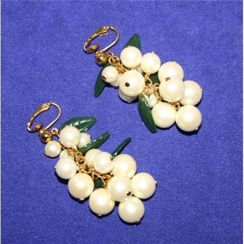 Very fun long Dangle Earrings with beautiful white glass beads depicting Grapes, riveted to a gold plated metal chain and highlighted with very well detailed Thermoset plastic Green leaves. Unsigned and made in the 1940s-50s, measuring 2 inches long and 1inch wide. Lots of play and movement in these wonderful, weighty and very well made vintage Dangle Cluster Earrings. Appear to be unworn!