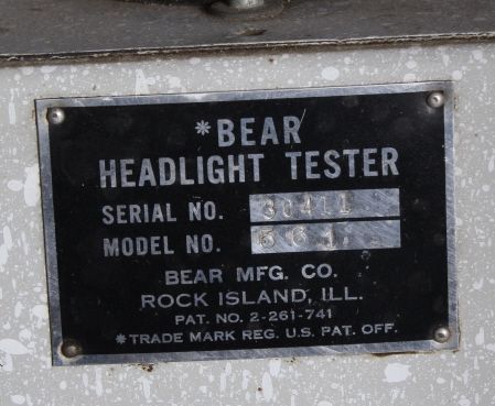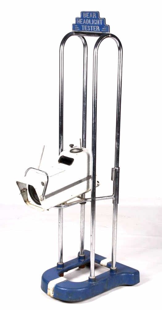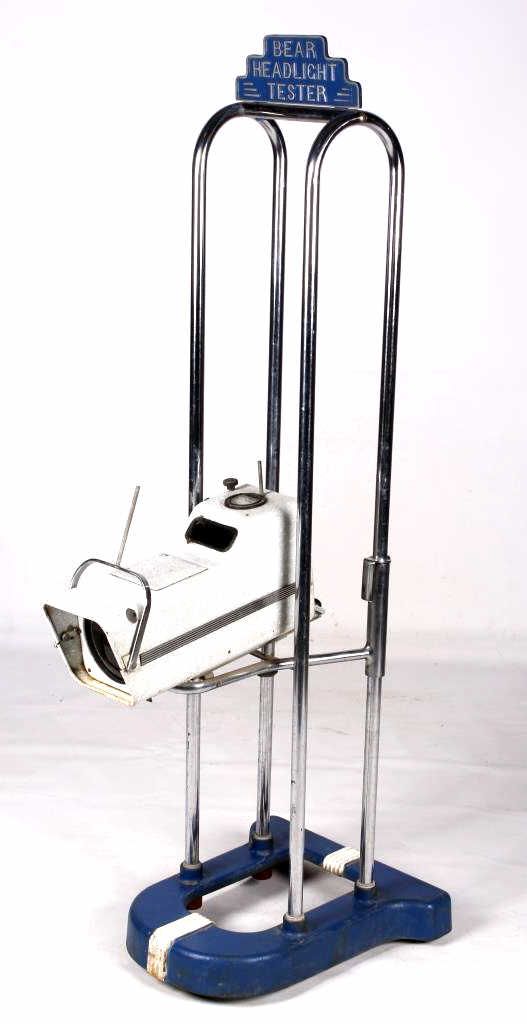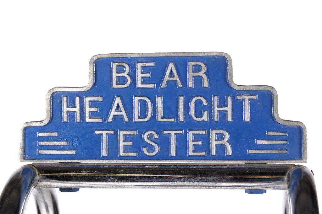 This is an original Bear Headlight Tester from an old garage or dealer. This mid century piece shows good condition, unknown if it works. The tester has a great Art Deco style with a metal top sign and metal base. This is a rare item and would be a great addition to any car collection. Measures 18.75"x26"x62.25"