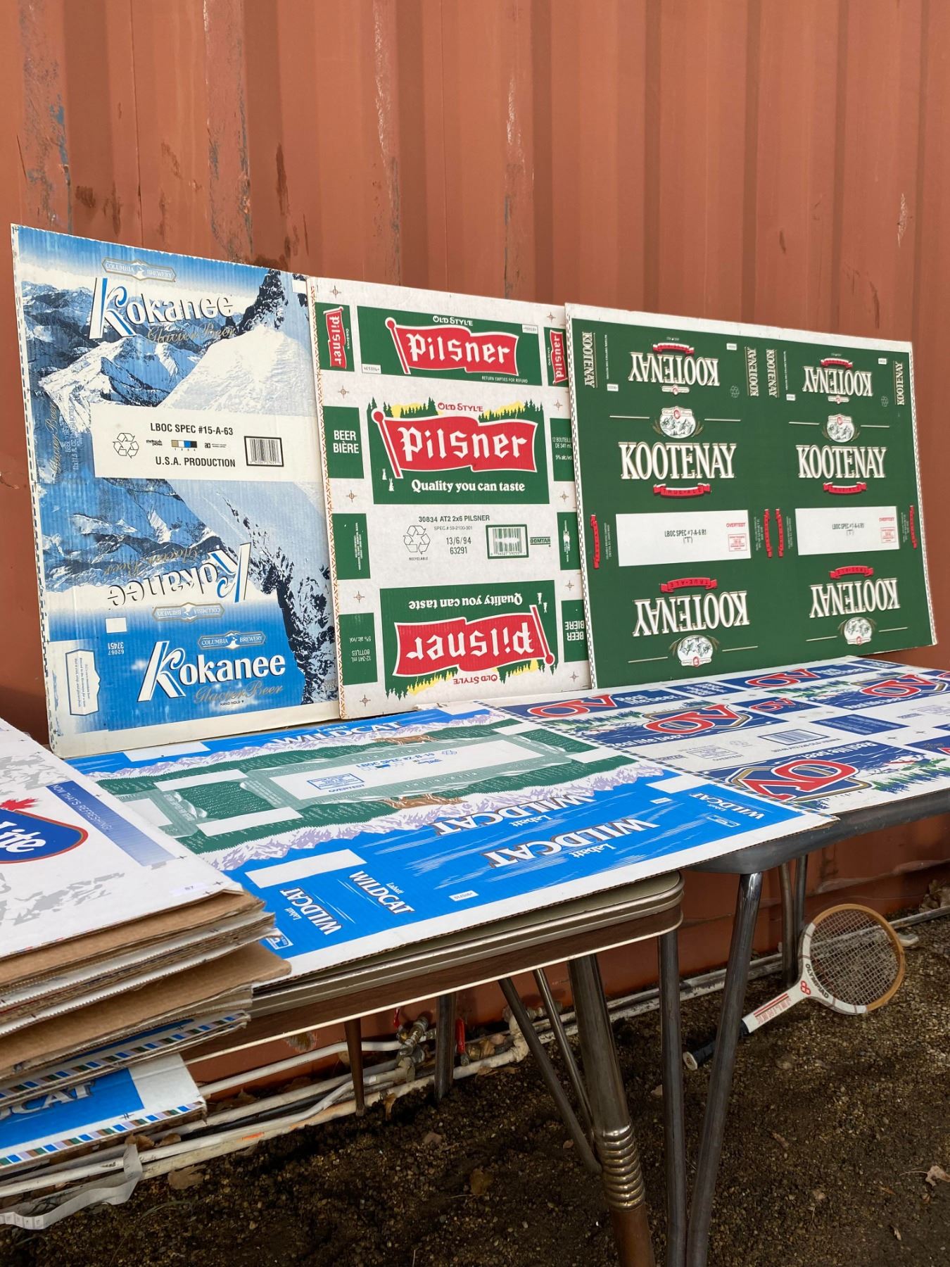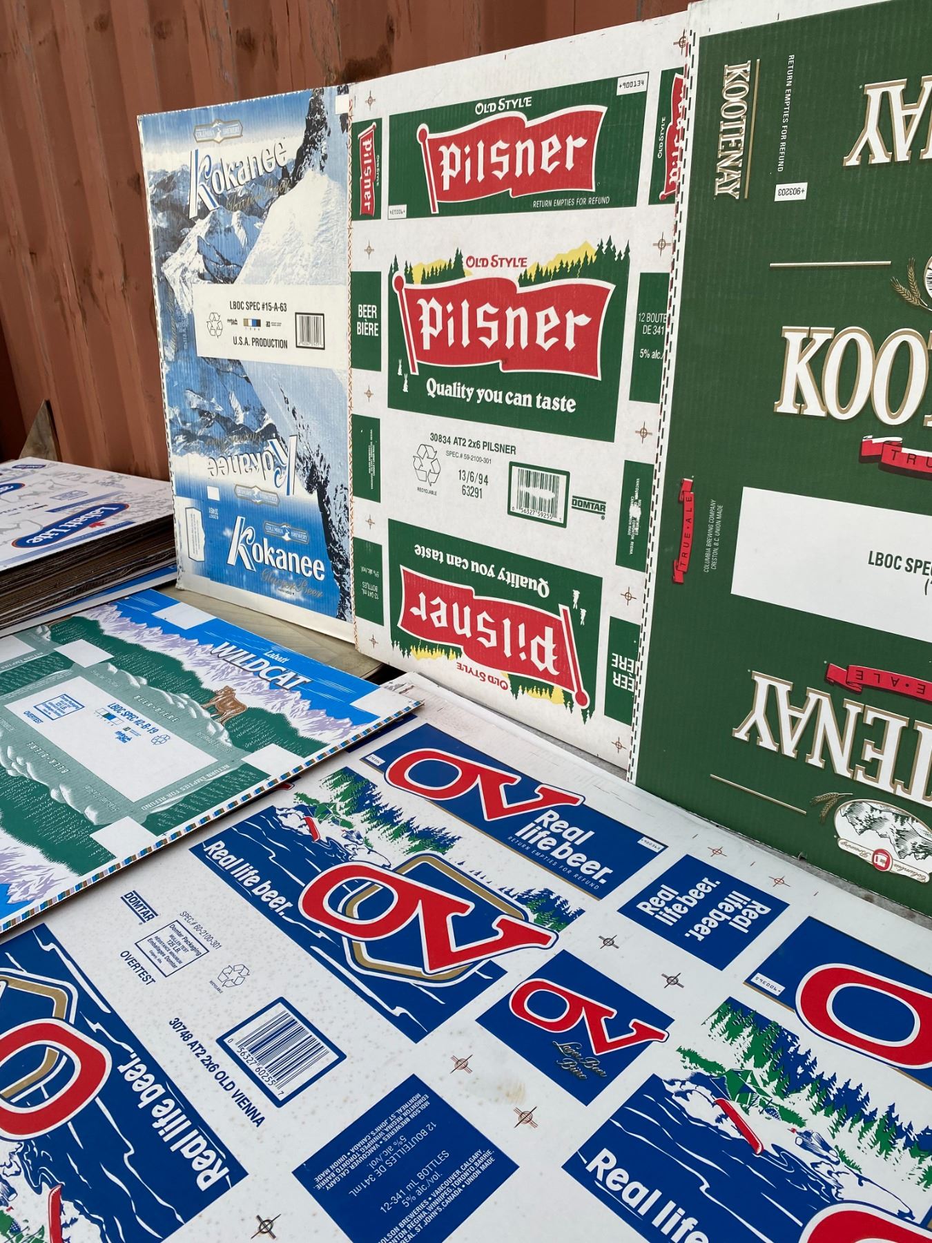 Large assortment of vintage beer case flats including Kokanee, Pilsner, OV, Wildcat, and Kootenay. Ideal for decor, collectors, crafts, or brewery displays.