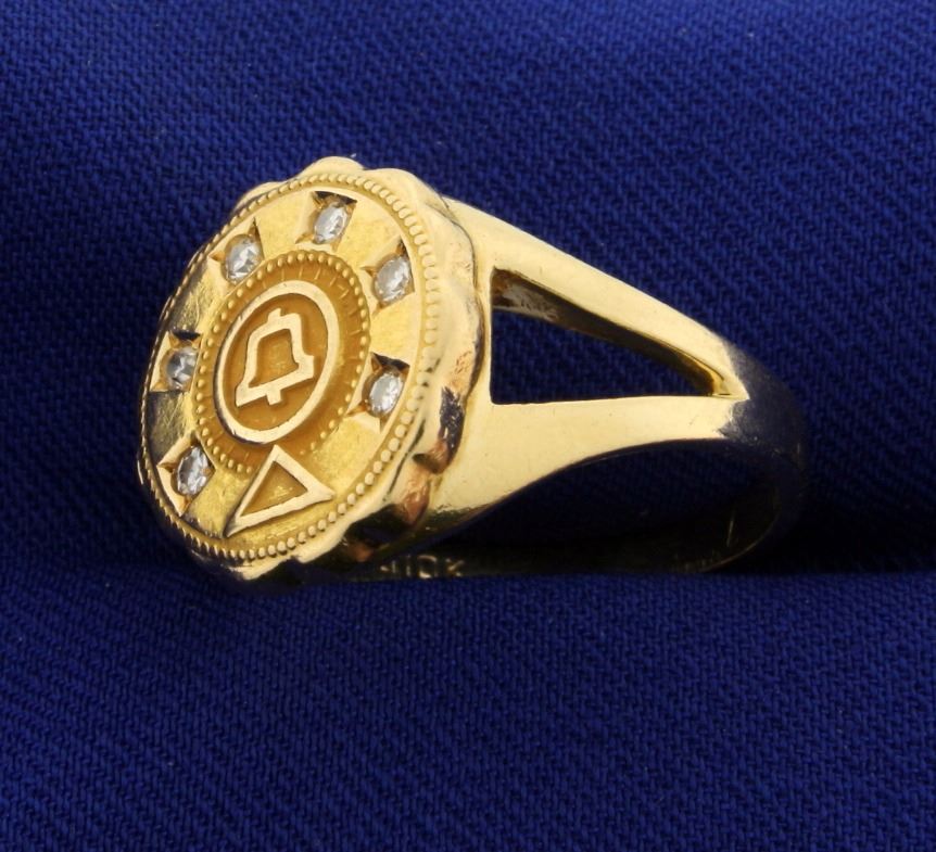 In 10k yellow gold, containing six 0.03ct high quality diamonds with VS clarity/ G color. Size 9. 10.1g.