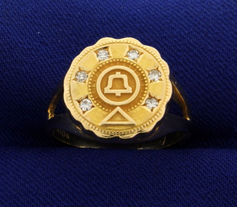 In 10k yellow gold, containing six 0.03ct high quality diamonds with VS clarity/ G color. Size 9. 10.1g.