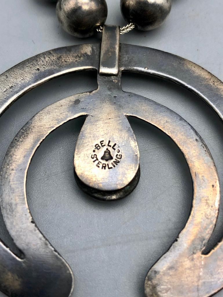 Presented for sale in this lot is a vintage Bell Trading Post squash blossom necklace. It is set with three beautiful turquoise stones and hand stamped designs on the naja. The silver beads are strung on foxtail chain and it is sterling silver. Maker: Hallmarked Bell Trading Post. Approx. Age: Circa 1960s. Size: Fits a 19 inch neck. Pendant measures 2 inches long X 2-1/8 inches wide. Weighs 106.4 grams. Condition: Good for its age, normal wear expected. Please look closely at the pictures - they are an important part of our description. Shipping: There will be a $5 handling / packaging fee for shipping this lot. The actual cost of postage will be added on top of that. BUY IT NOW: If you would like to buy this item now without waiting for the auction to end (this option is only available up to 48 hours before the auction starts to close), the “Buy it Now” price is the high estimate of this lot. If you would like to end the auction early and pay the high estimate (plus applicable fees), please contact us by phone or email and reference this lot number.