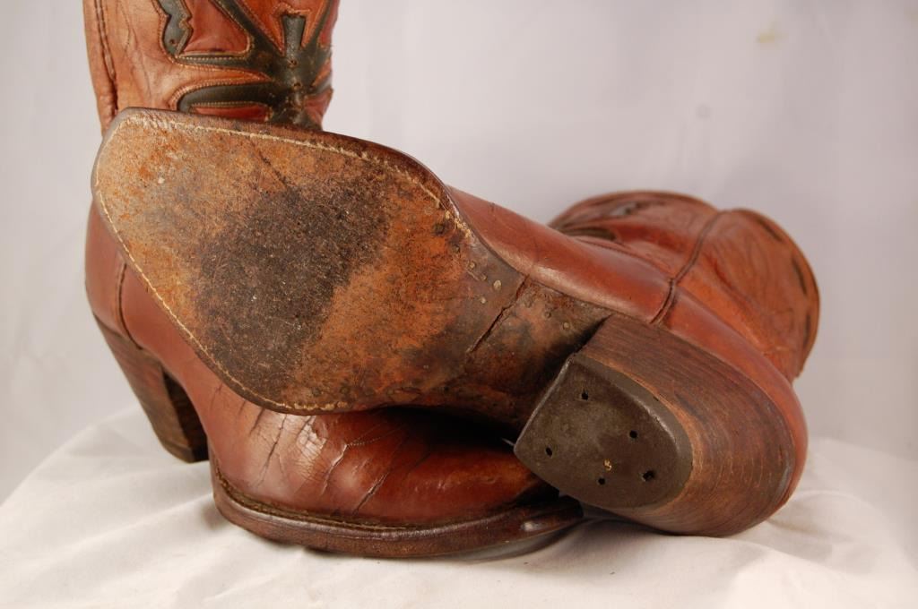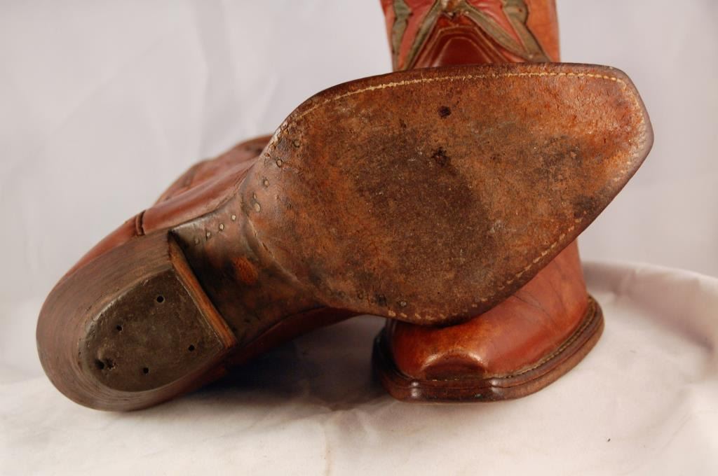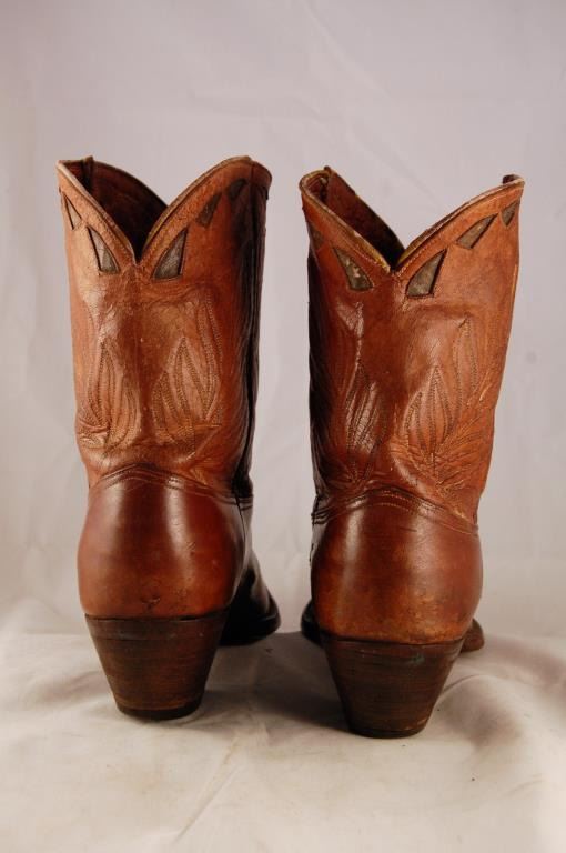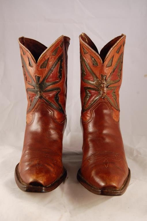 Vintage bench-made cowboy boots with high heels, block toes, pegged shanks, and butterfly inlaid red, green, and tan. 6" tops. Good looking and in pretty good condition.