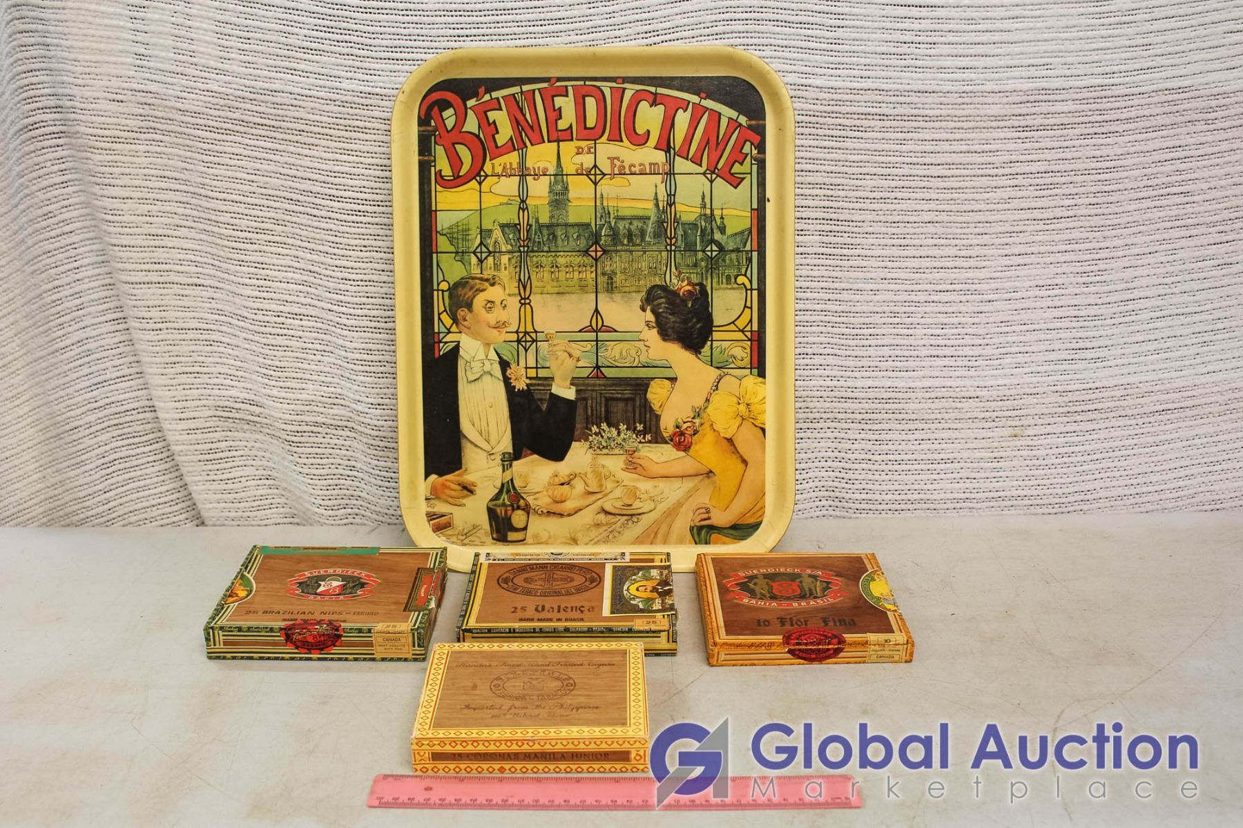 Vintage Benedictine Tray and (4) Cigar Boxes