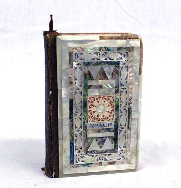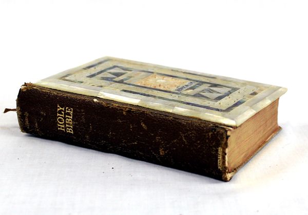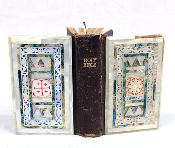 Vintage Bible with Carved Mother of Pearl and Abalone Inlay Cover, measures 3.5'' x 5.5'', the word Jersusalem is carved in the center of the front cover, both front and back are inlay, Holy Bible embossed on side, printed in Great Britain, Authorized King James Version, London and New york Collins' Clear-Type Press, Glasgow-Toronto-Sydney and Auckland (New Ruby 24mo Text)