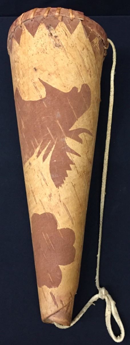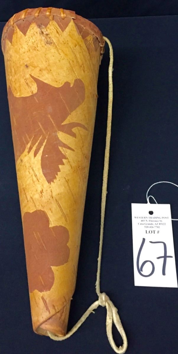 This vintage birch bark quiver is 16” long. There is some stitch loss around the rim. Please look closely at the pics as they are an important part of our description. Shipping: There will be a $7 handling / packaging fee for shipping this lot. The actual cost of postage will be added on top of that.