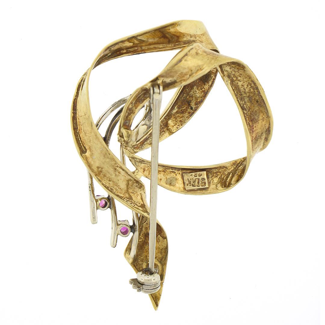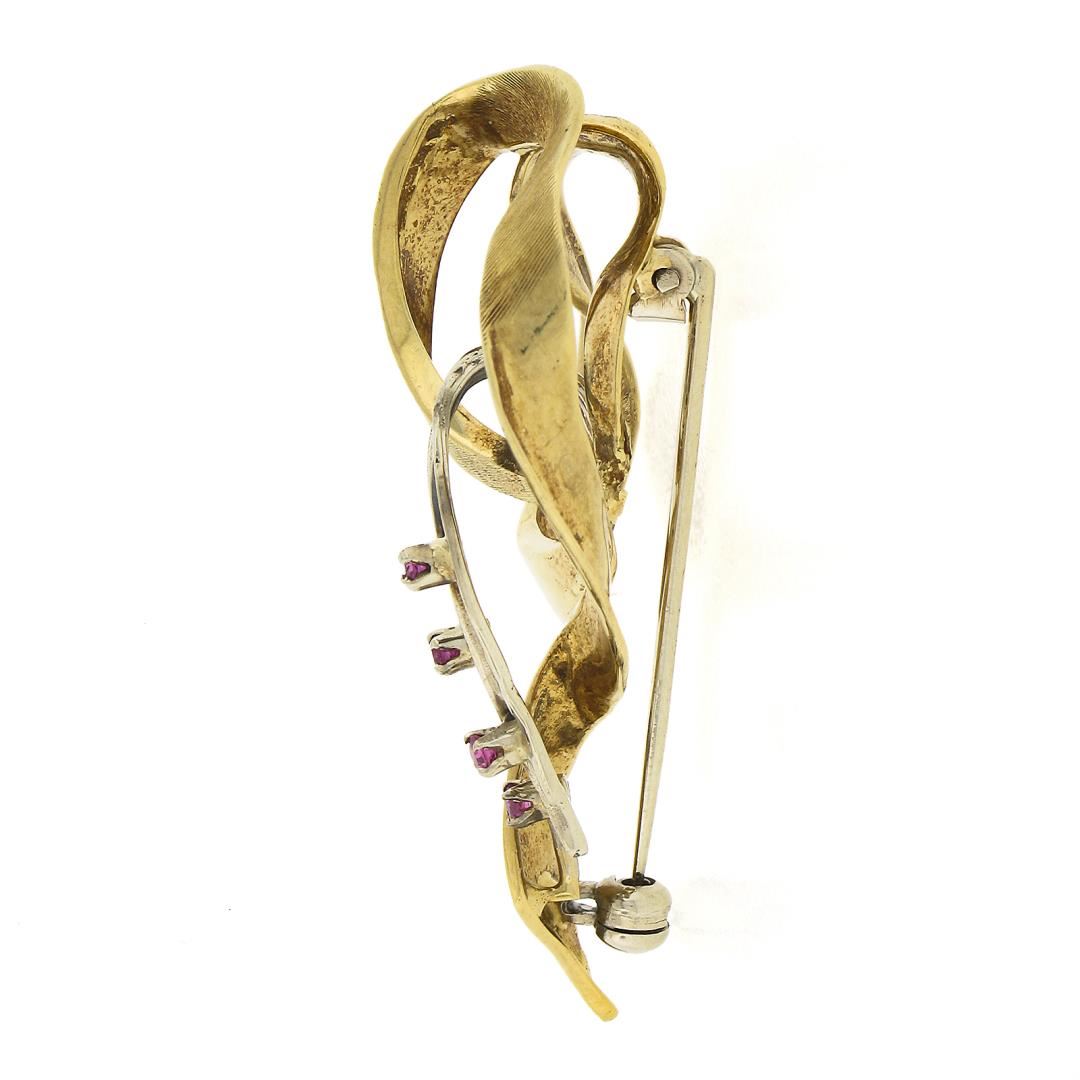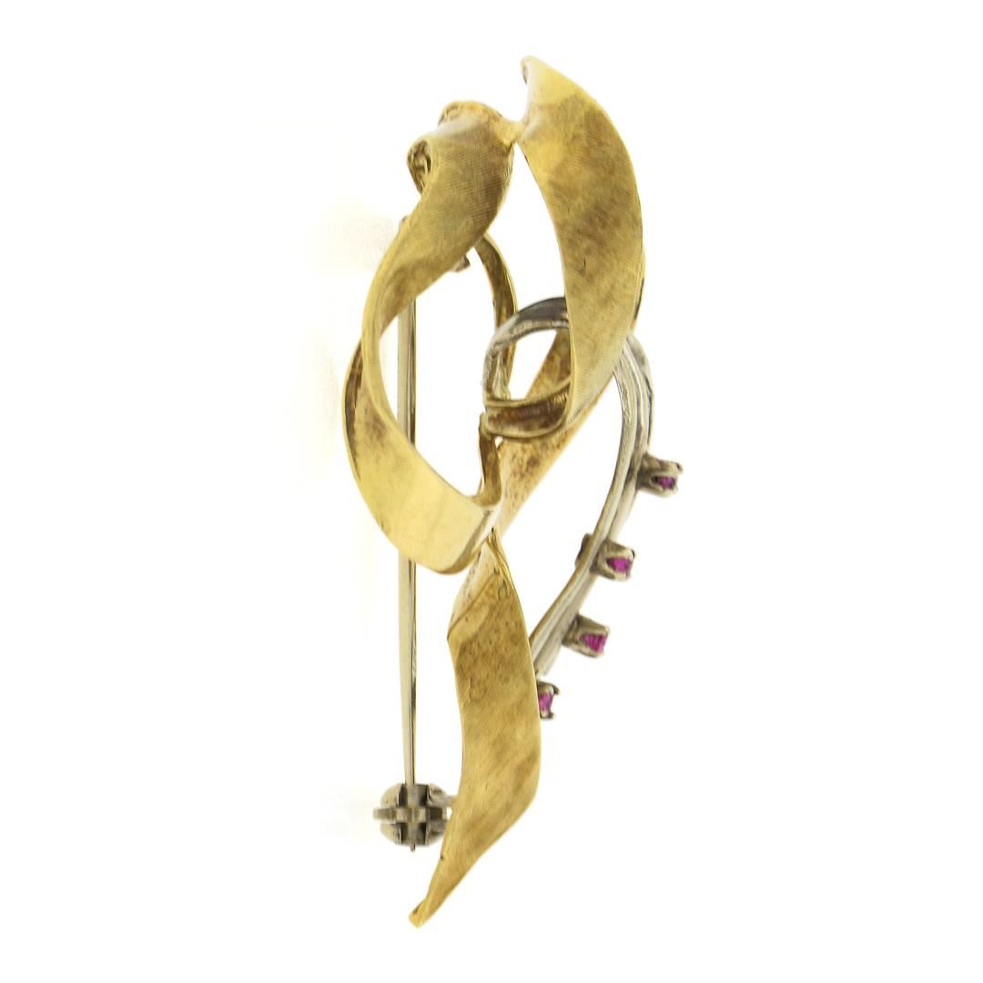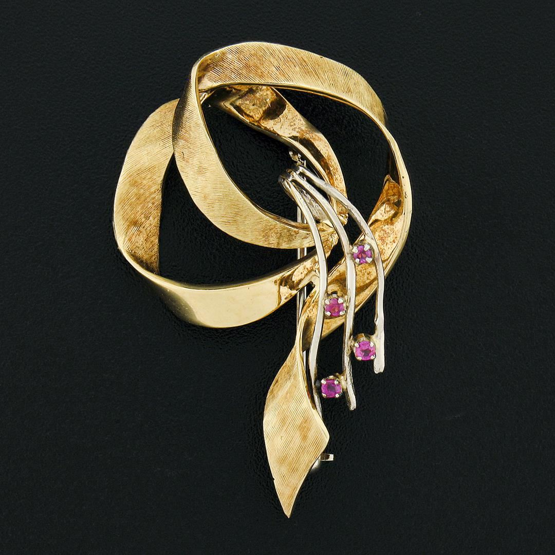 A vintage solid 18k yellow & white gold brooch, with 4 old round cut natural rubies (0.10ctw). Measures 45.97x29.7mm and weighs a total of 7.29 grams.