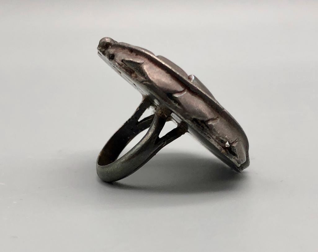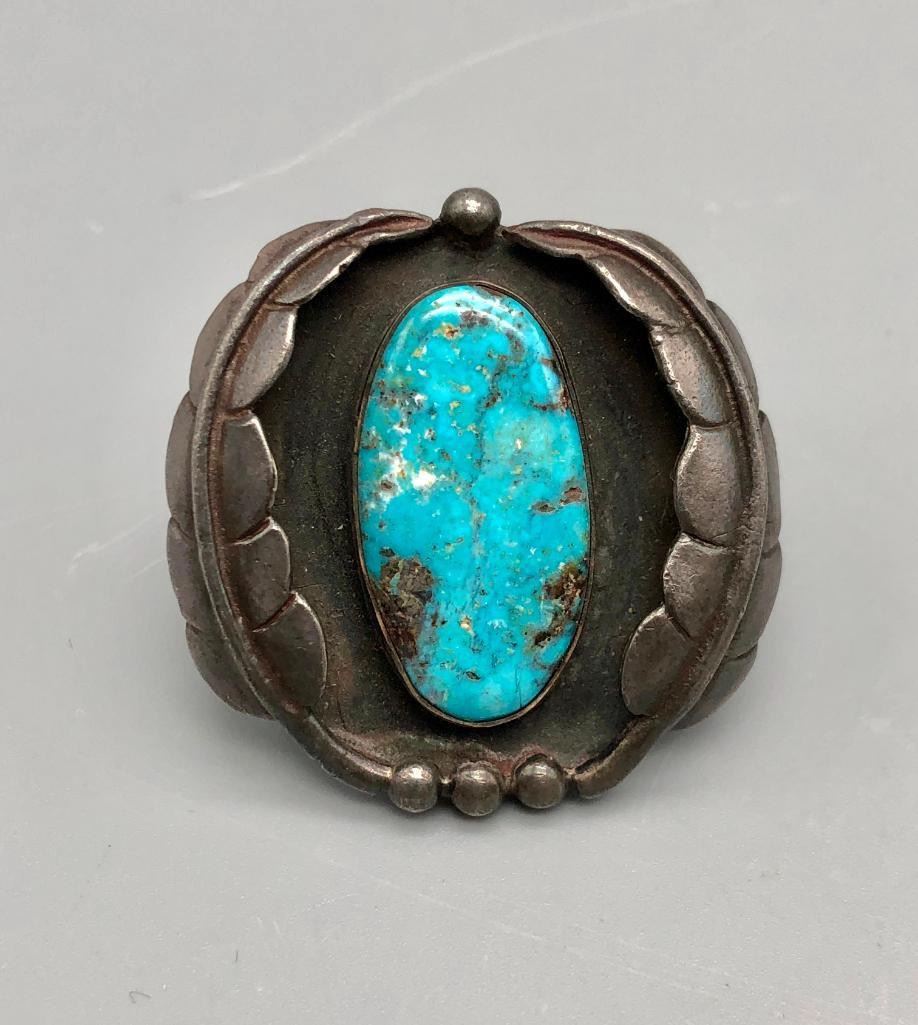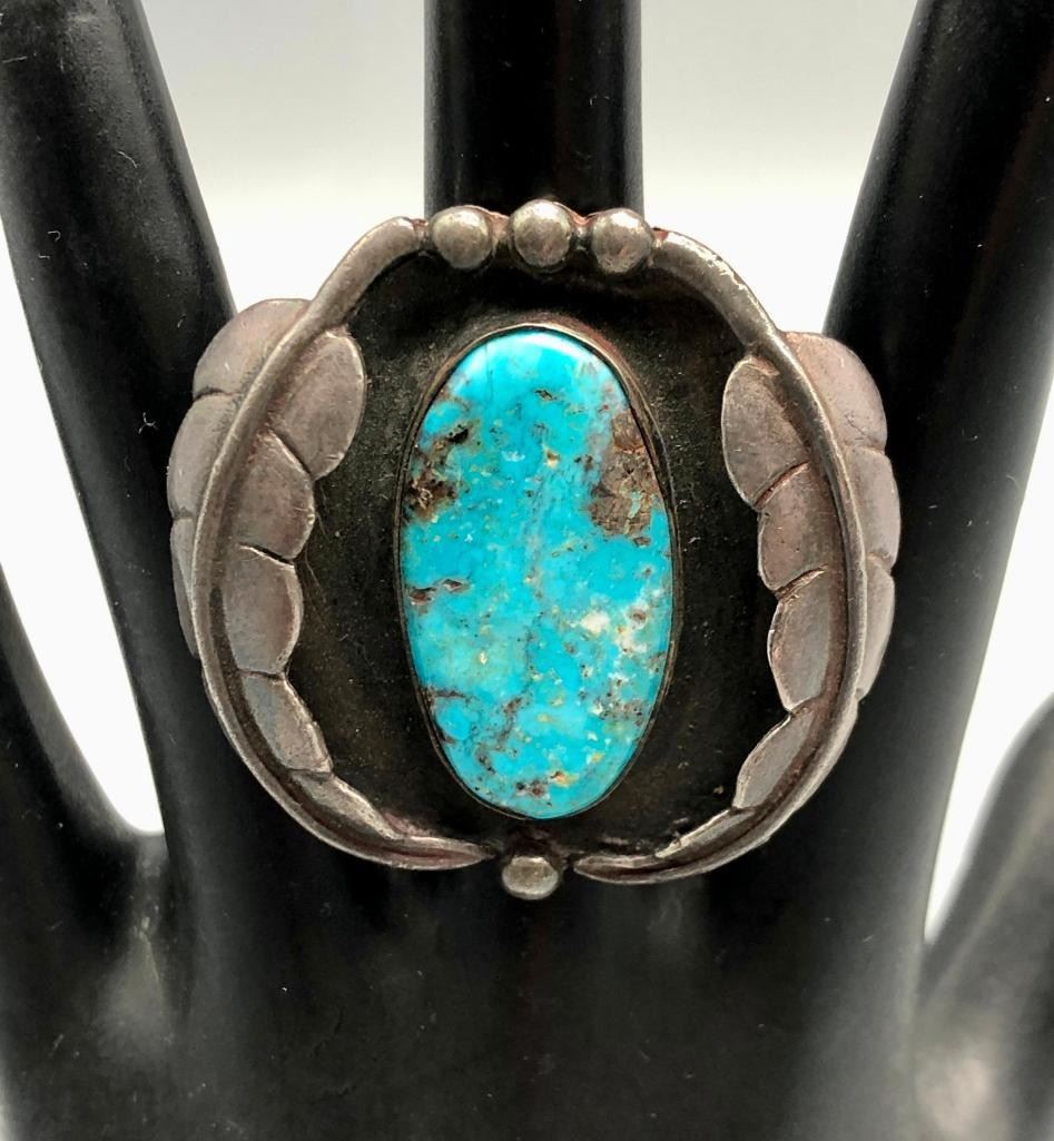 For sale in this lot is a vintage ring which appears to be set with Bisbee turquoise. It has a heavy leaf applique design around the stone with silver drops accenting. Made from sterling silver. MAKER: Unmarked. APPROX AGE: Circa 1970s. SIZE: Ring size is a 8. Measures1-5/8 inches wide X 1-5/8 inches long. Weighs 29 grams. CONDITION: Good for its age, normal wear expected. Please look closely at the pictures as they are an important part of our description and are hereby incorporated into the description, specifically with regards to condition. SHIPPING: There will be a $5 handling / packaging fee for shipping this lot. The actual cost of postage will be added on top of that. BUY IT NOW: If you would like to buy this item now, without waiting for the auction day to bid on it, we do offer this option (which is available up to 48 hours before the actual auction starts). The “Buy it Now” price is the high estimate of this lot (plus applicable fees and the Buyer's premium is discounted to 10% when using the Buy it Now option). If you would like to exercise this option, you must contact us by email (or phone as long as you talk to someone live). Reference this lot number and your intention to "Buy it Now."