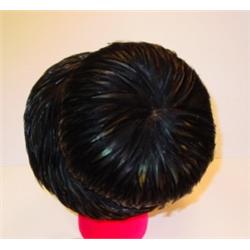 Vintage feather hat in black with velvet bow trim. Label "Styled by Helene". In box marked "Suzy Hats".