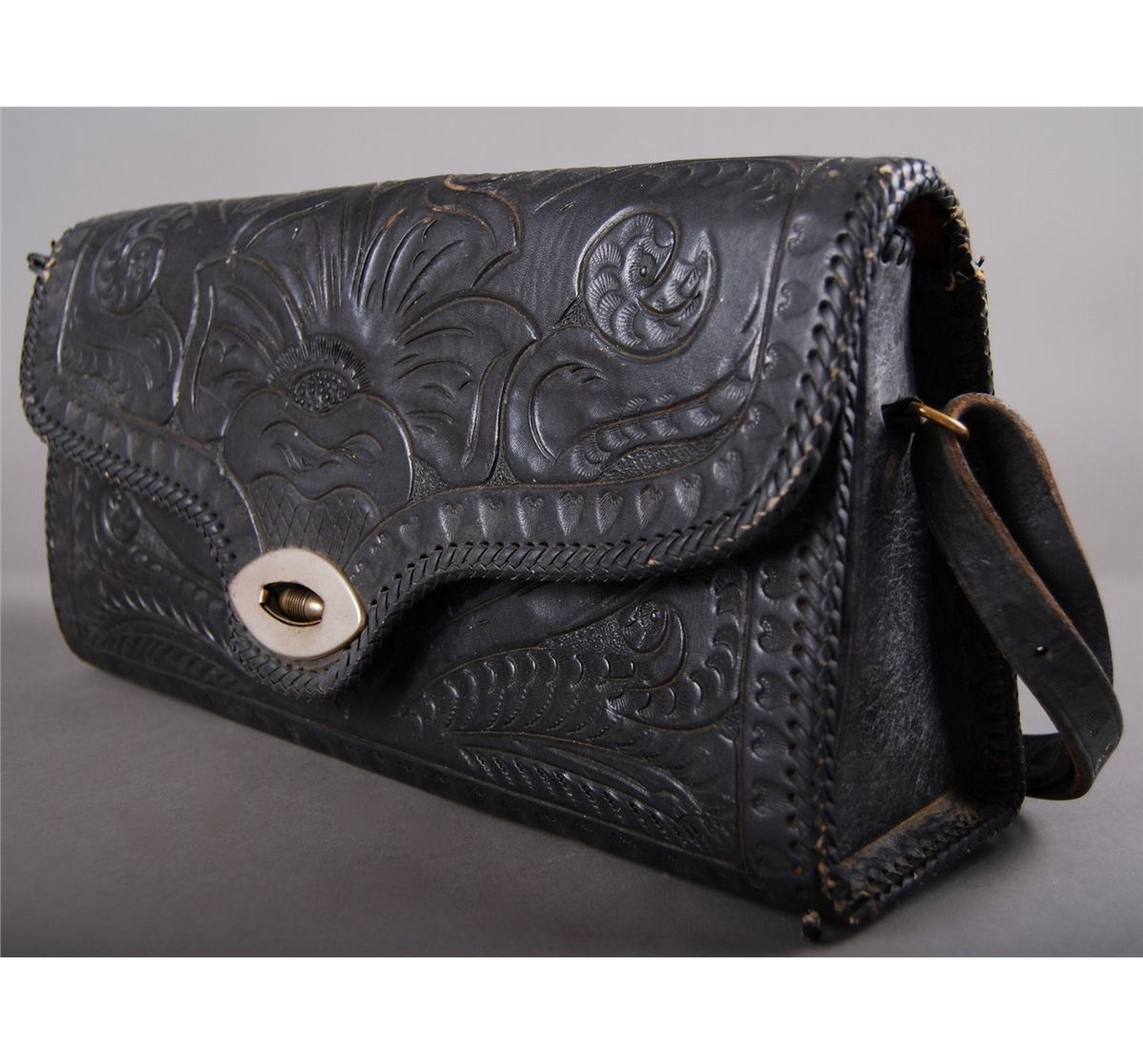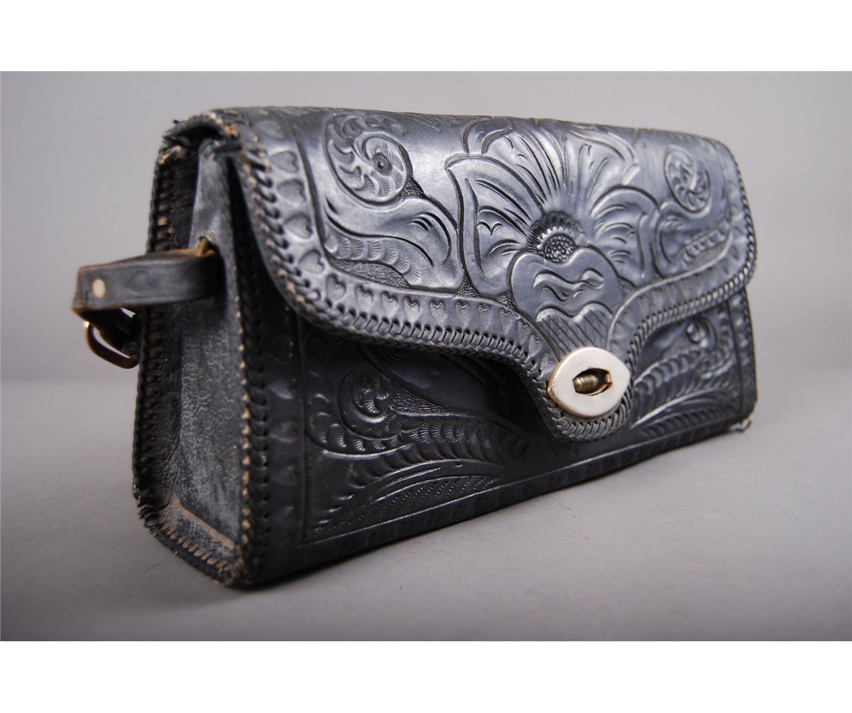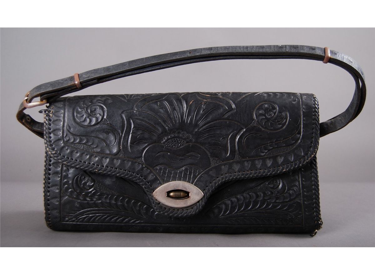 Vintage Black Leather Purse with Intricate Design [Height/Length (in)= 12.25, Width (in)=7, Depth (in)=3.5, Weight (lbs)=2] With C.O.A. signed by Chief Joe Dan Osceola & Seminole Tribe. Go to: www.pangaea-auctions.com for more information about this collection.