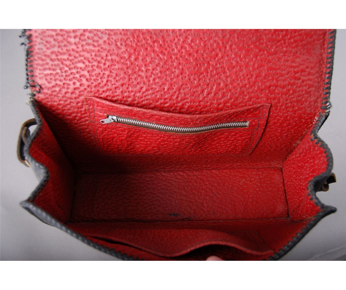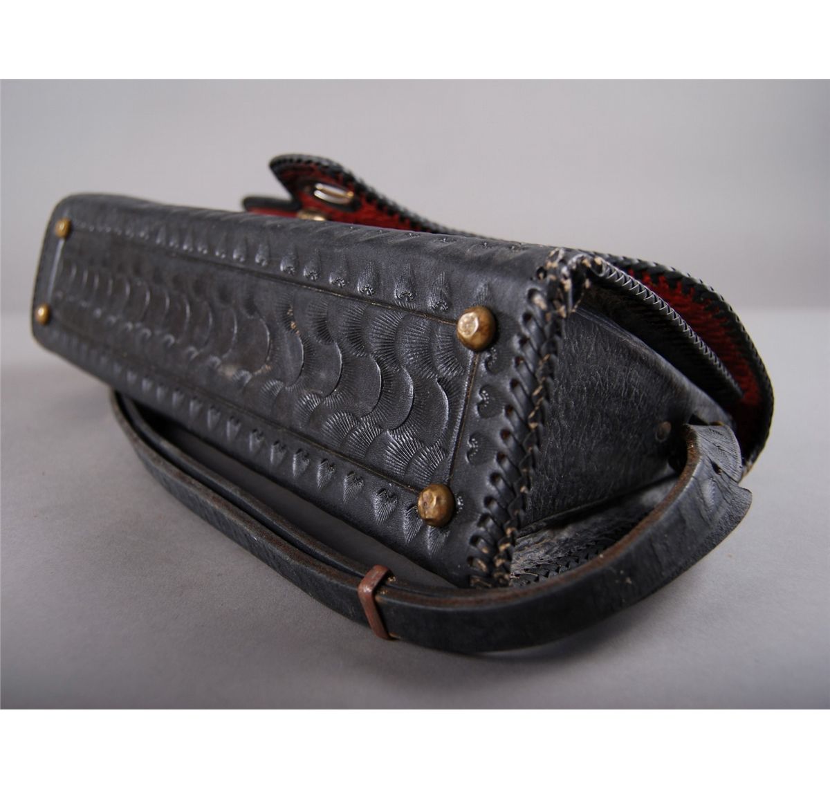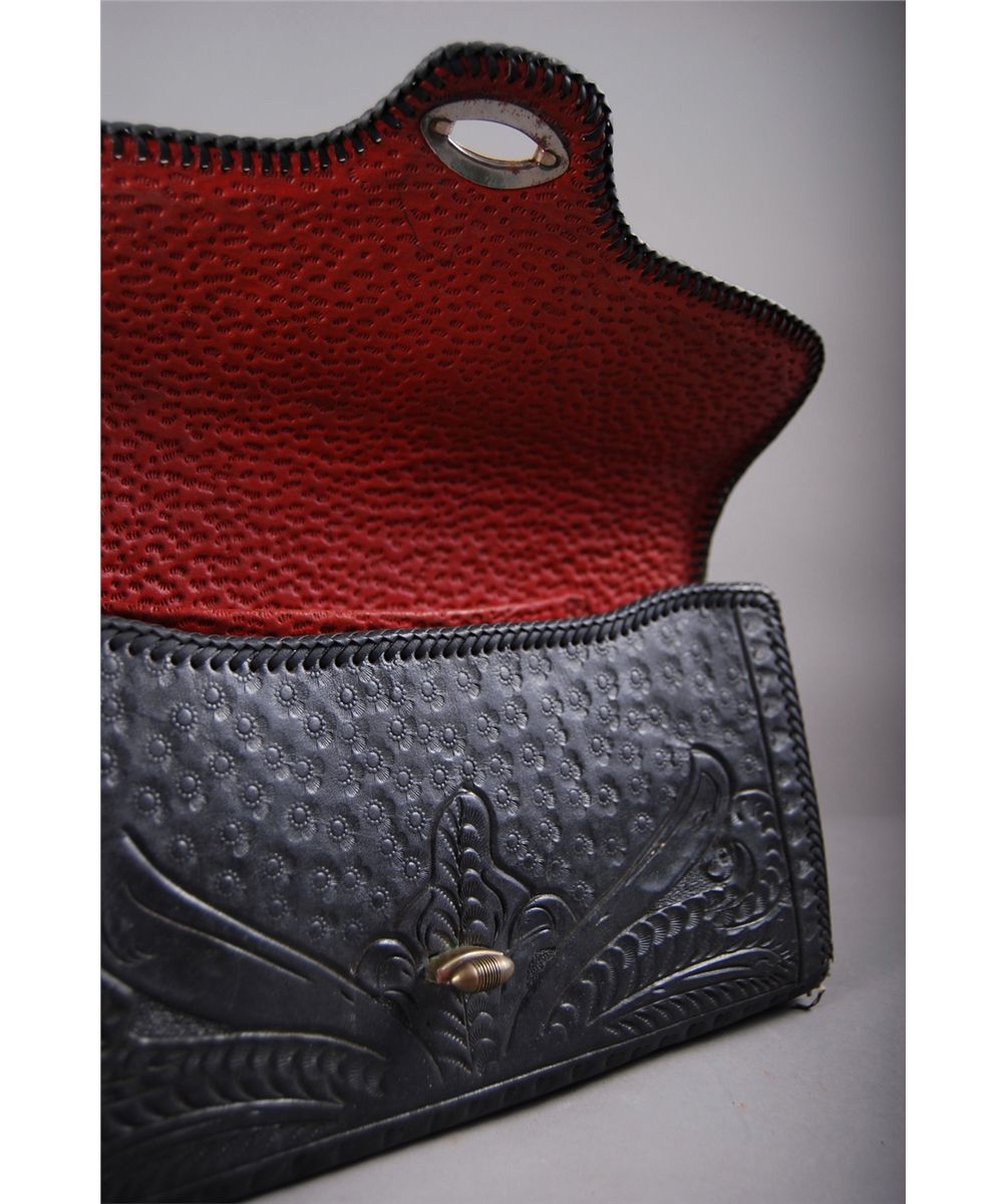 Vintage Black Leather Purse with Intricate Design [Height/Length (in)= 12.25, Width (in)=7, Depth (in)=3.5, Weight (lbs)=2] With C.O.A. signed by Chief Joe Dan Osceola & Seminole Tribe. Go to: www.pangaea-auctions.com for more information about this collection.