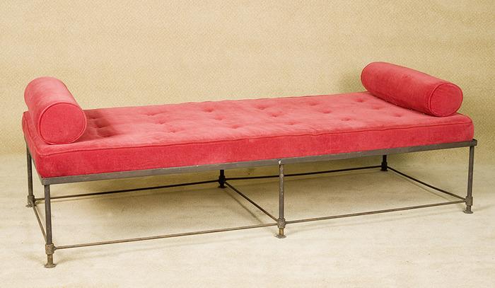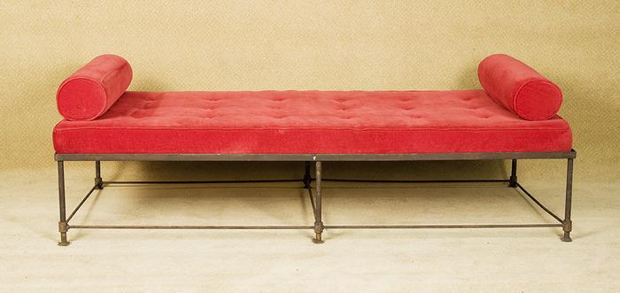 Vintage Black Wire Frame Bench with Red cushion and Arm Cushions
