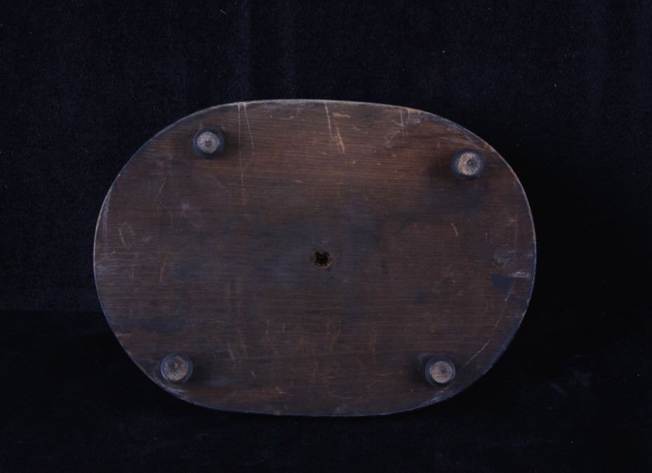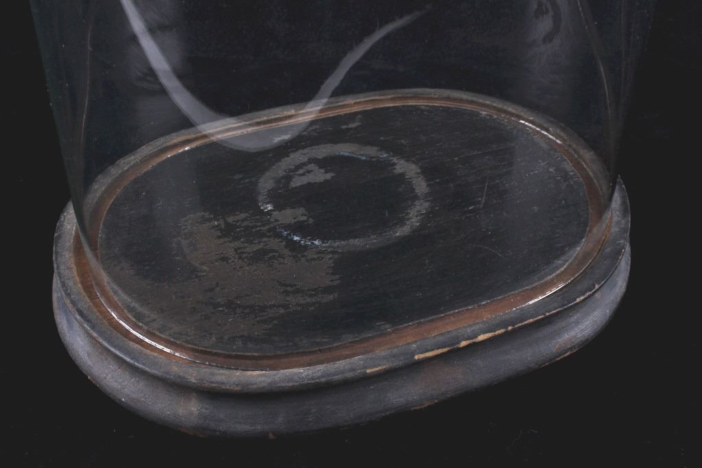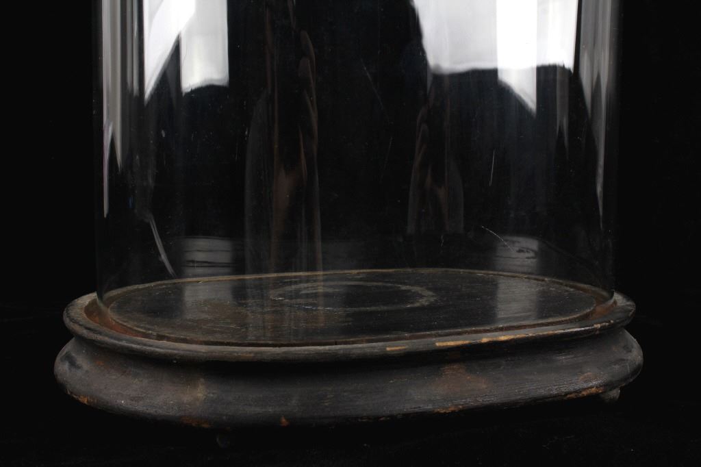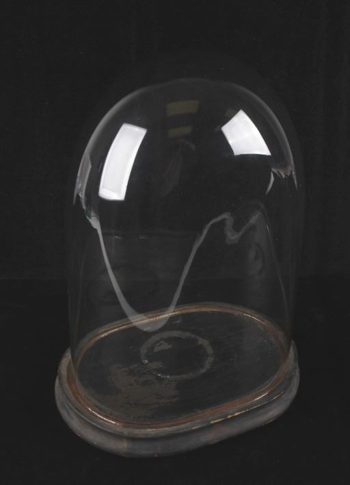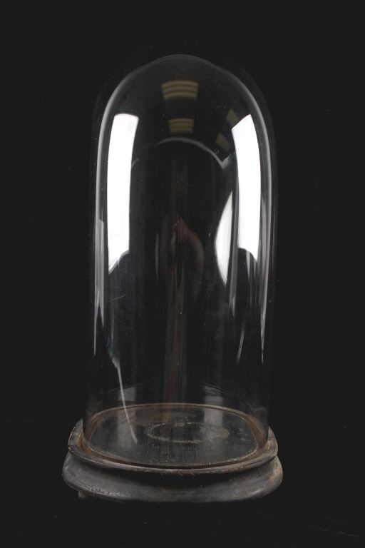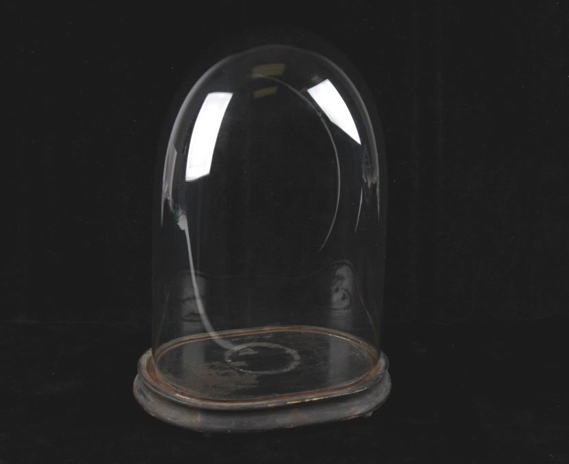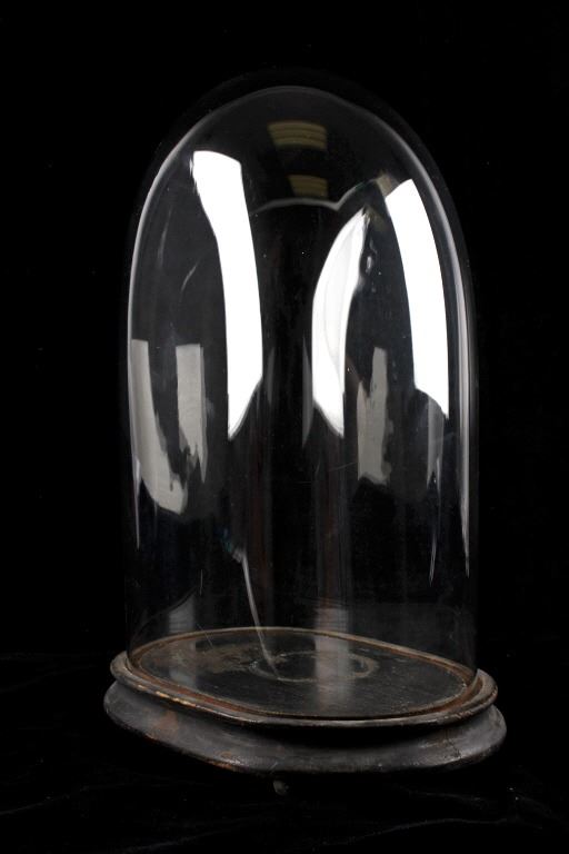 For your consideration is an antique blown glass display cloche dome with wooden base. This is a fully translucent, oval hand-blown glass cover for displaying and protecting it's contents. This type of display is commonly used for plants, but is big enough for wax fruit, small animal mounts, a clock, or other natural specimens. The glass is in good condition, and is rested on the wooden base within a groove to keep from sliding off. The wooden base is free from cracks, and is dark in color, with wooden counter procting feet. The piece measures approximately 16"H x 7"x 10.75".