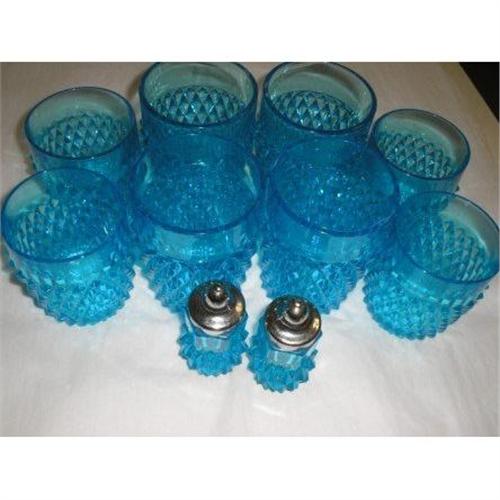 Vintage Blue Hobnail pattern glassware. This offering includes Salt and Pepper shakers, 4 small tumbler and 4 medium tumblers.