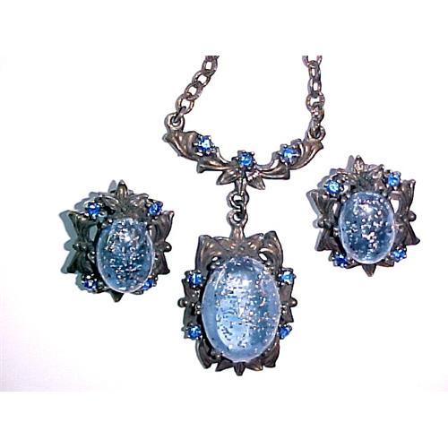 ornate silver cast metal with gorgeoushuge oval cabochon of blue glass containing silver metallic flecks. Surrounding each cab is 4 blue faceted rhinestones. The cabochon of the earrings stand up from the setting 6mm high. The pendent in which the cabochon is larger but set more shallow in the setting