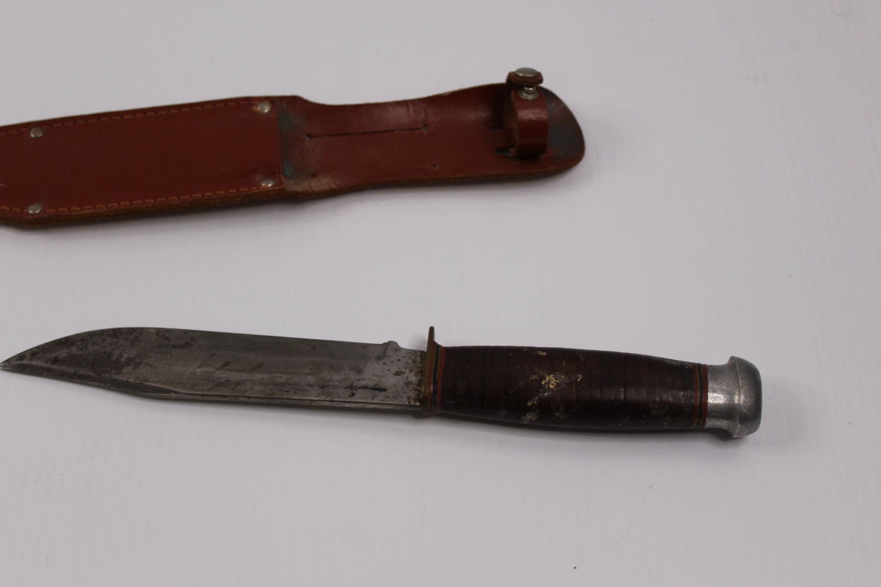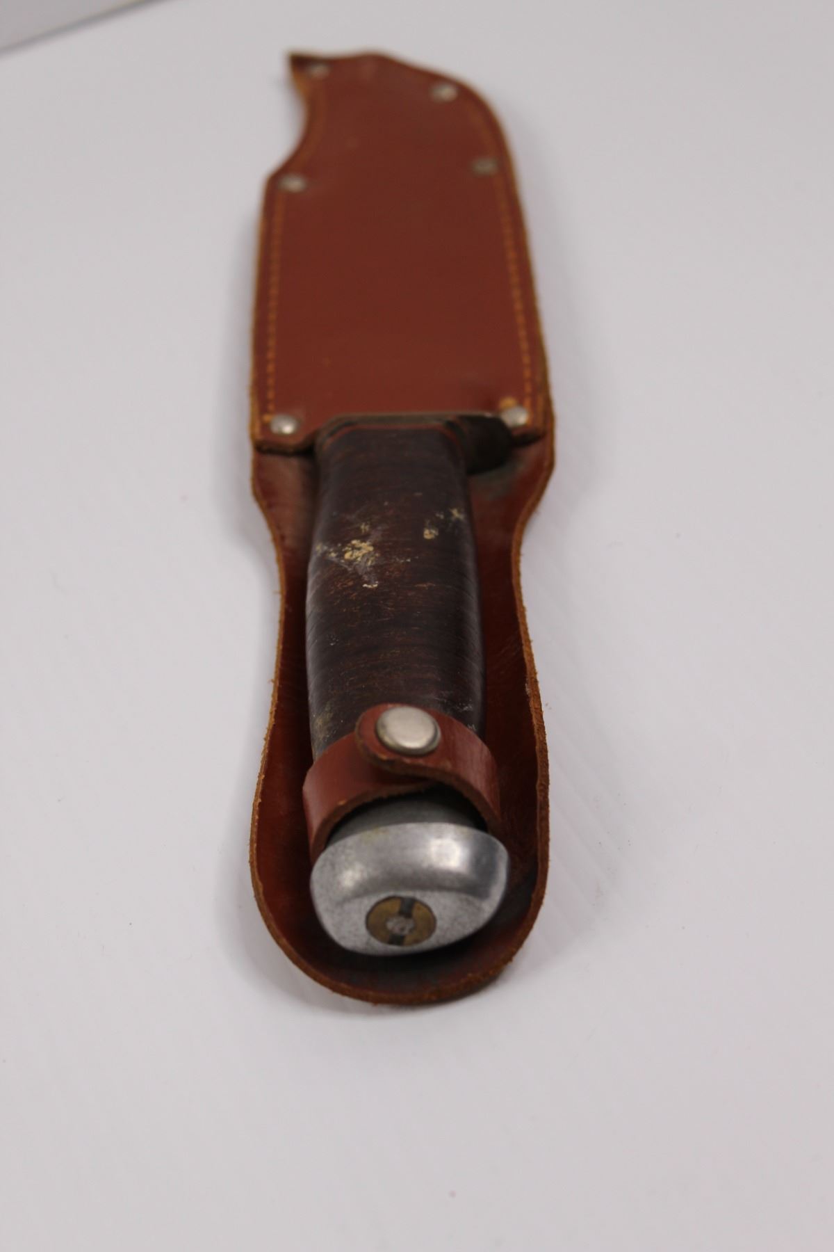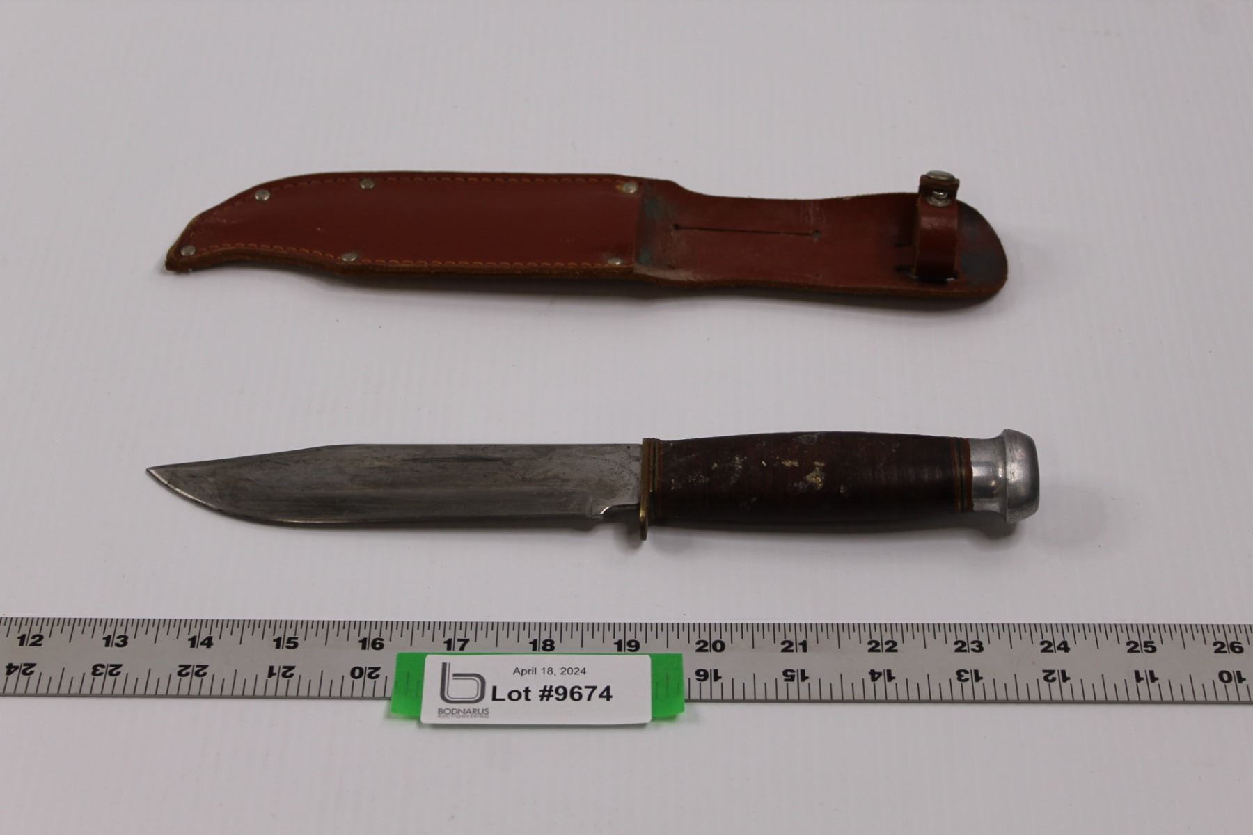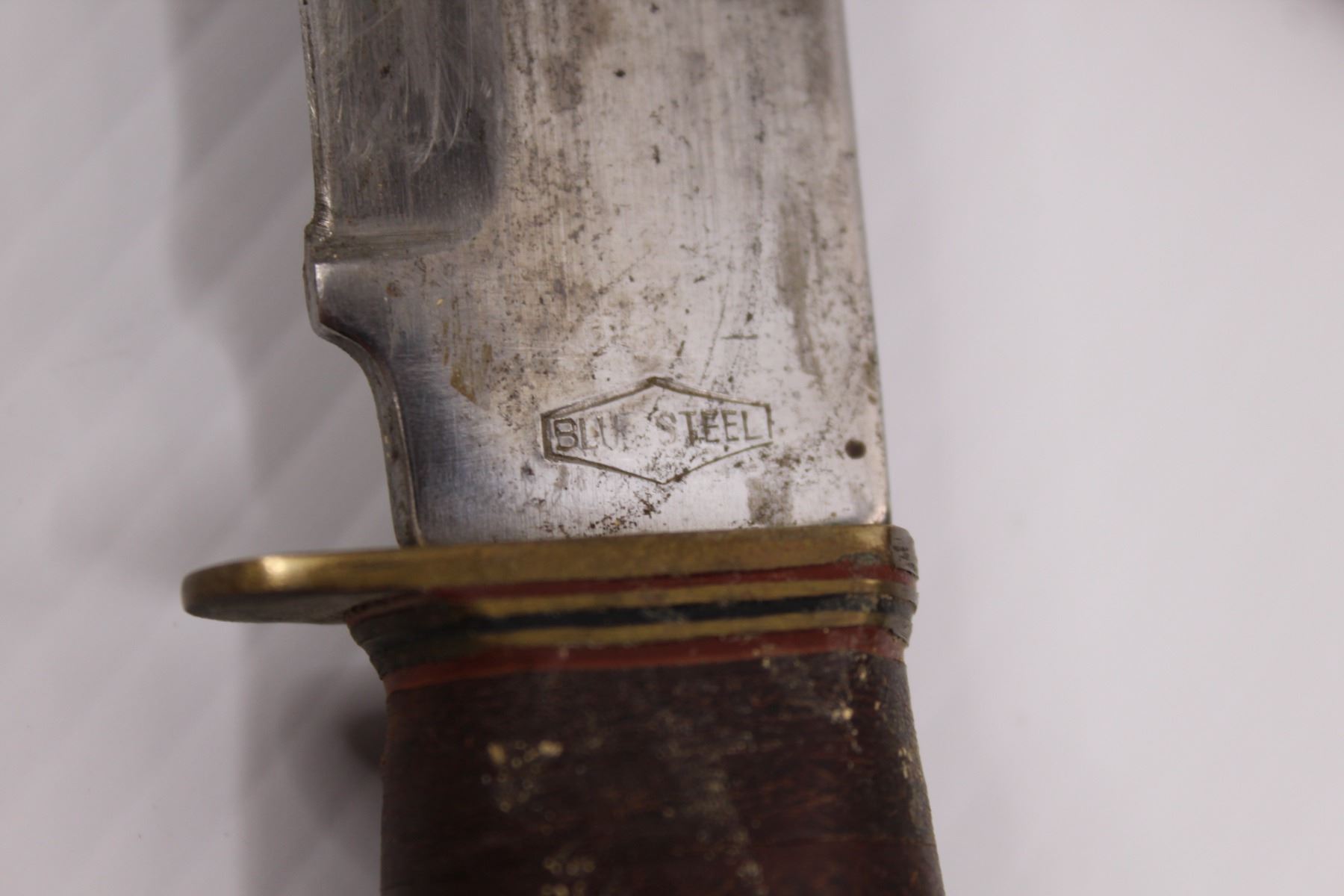Vintage Blue Steel Clip Point Fullered Bowie w/Leather Stacked Handle, Brass Spacers/Guard, Aluminium Palmel & Genuine Leather Sheath