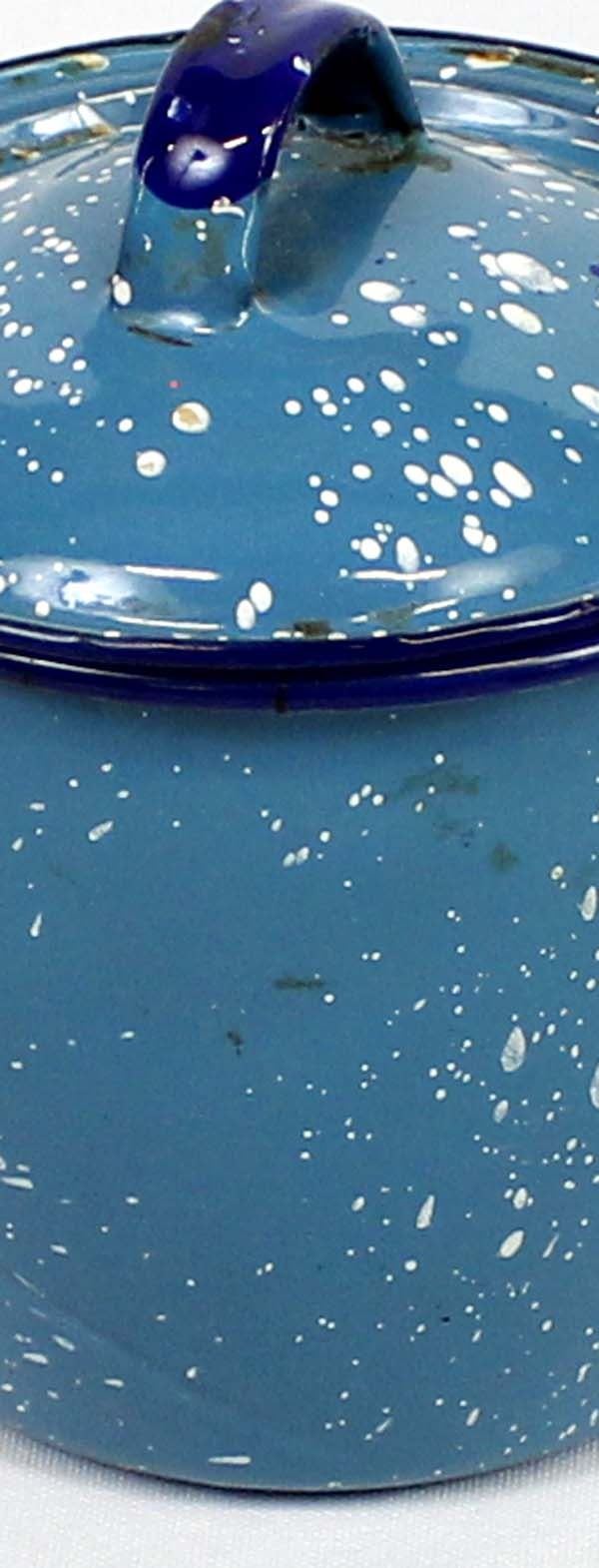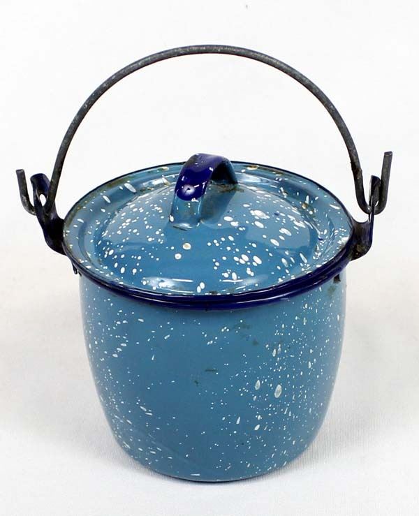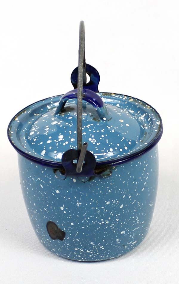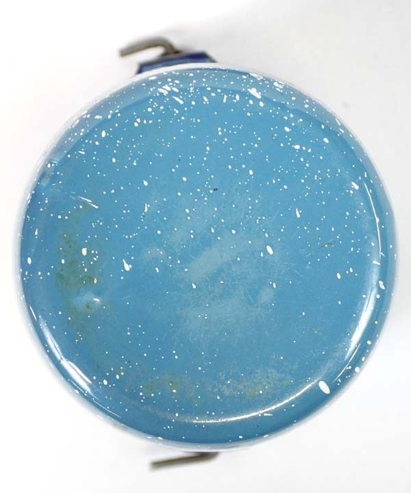 Vintage Blue & White Splatter Graniteware Lidded Pot, measures 4'' x 4''
