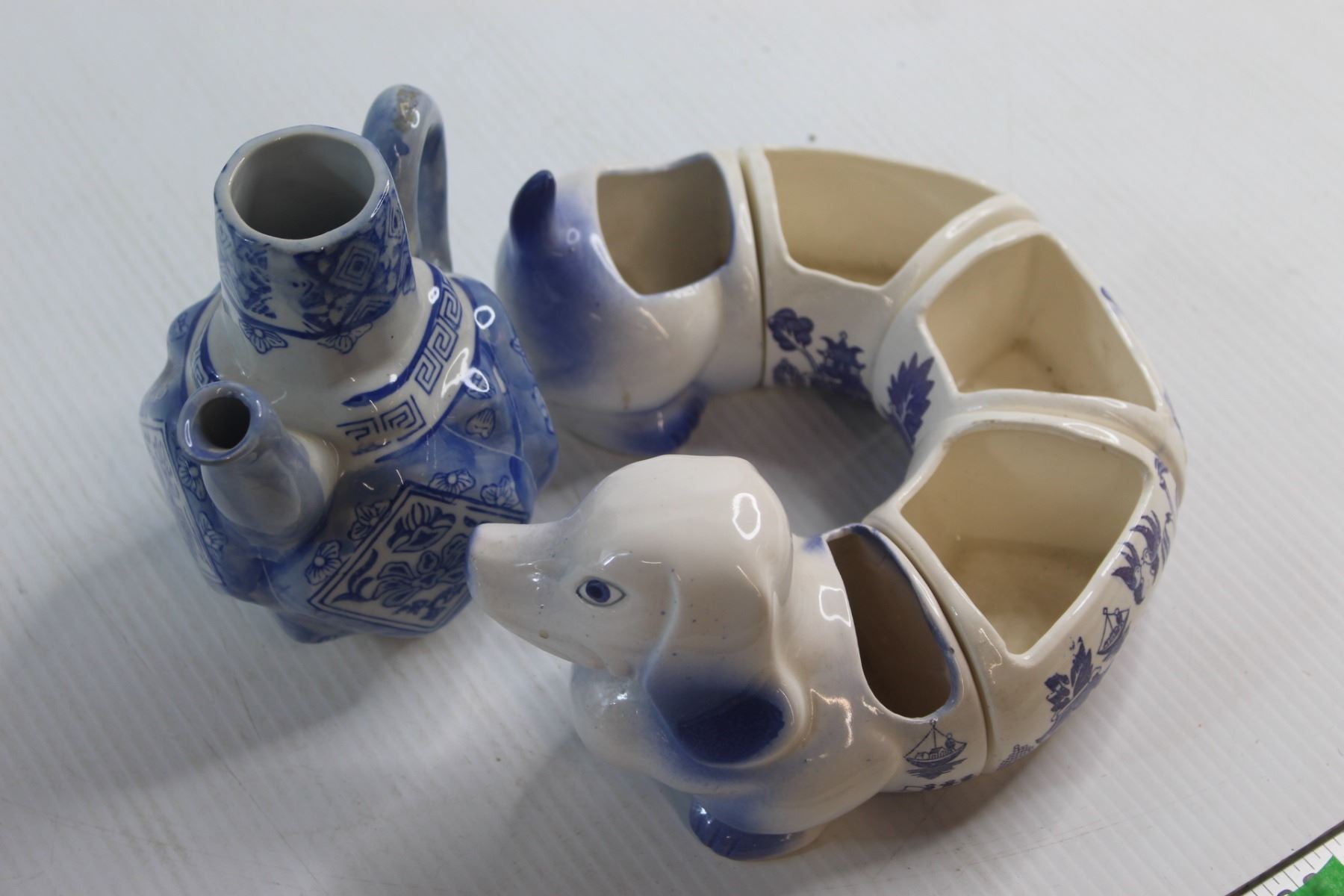 Vintage Blue Willow 5 Piece Dachshund Condiment Set and Flow Blue Tea Pot