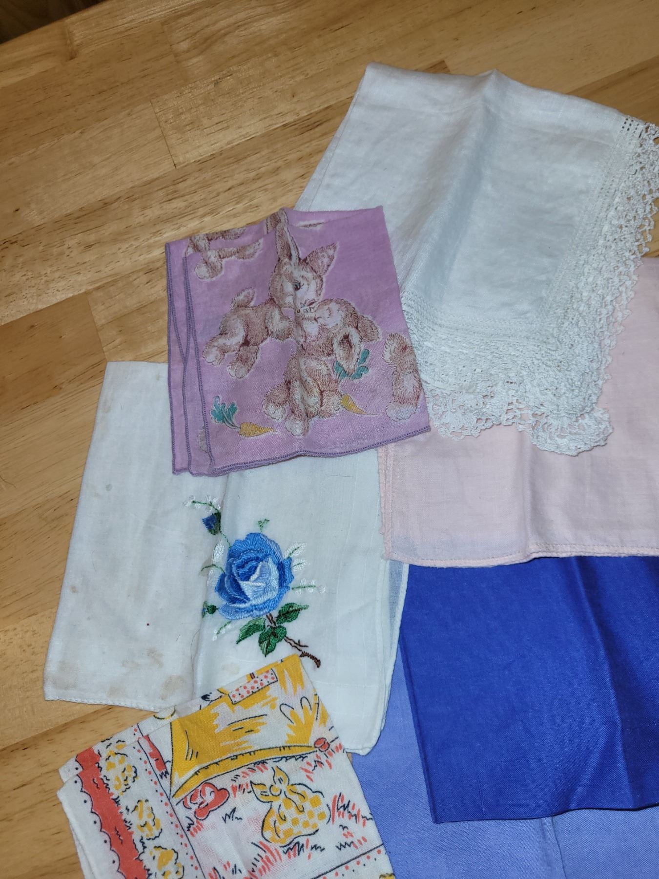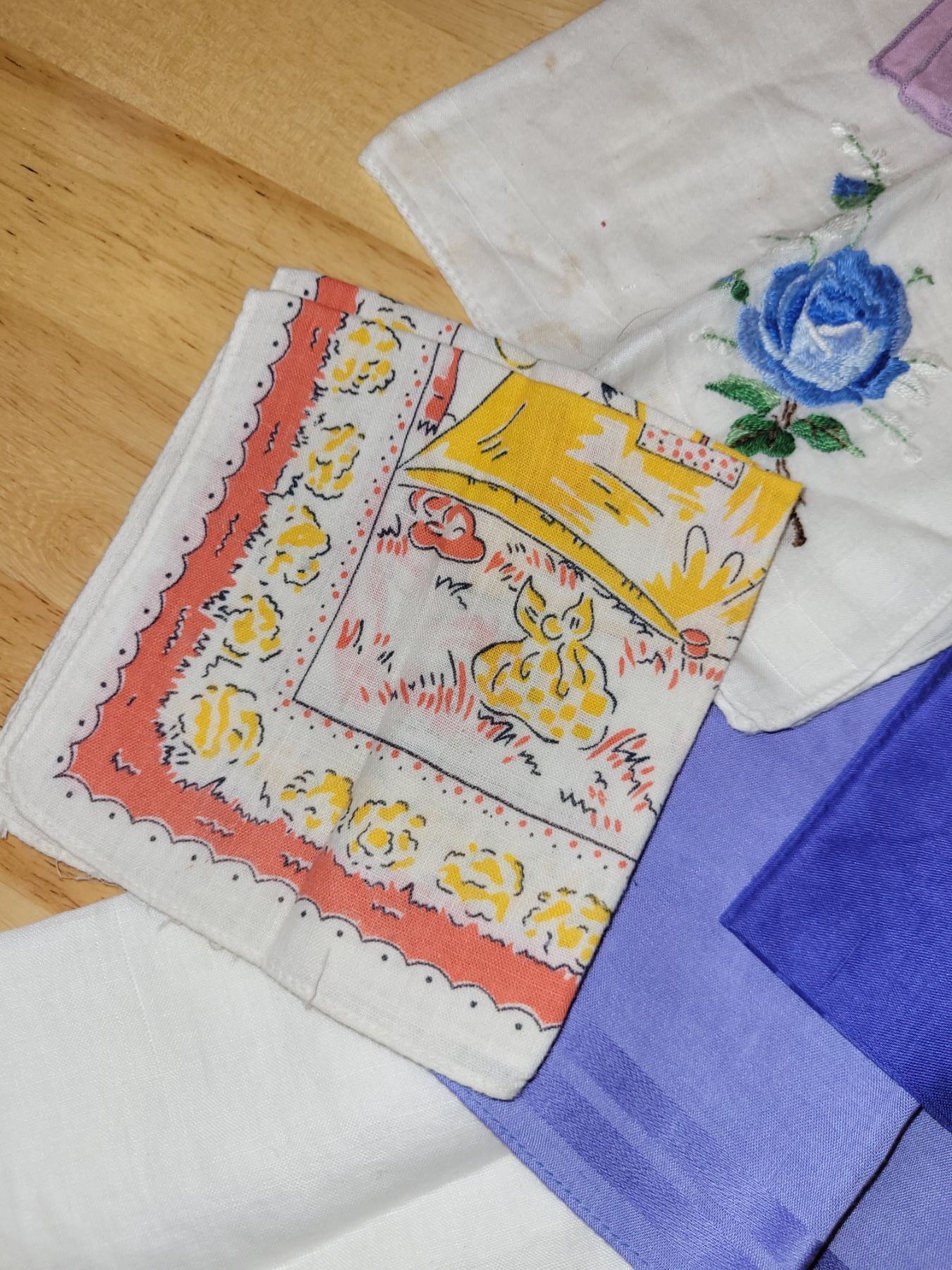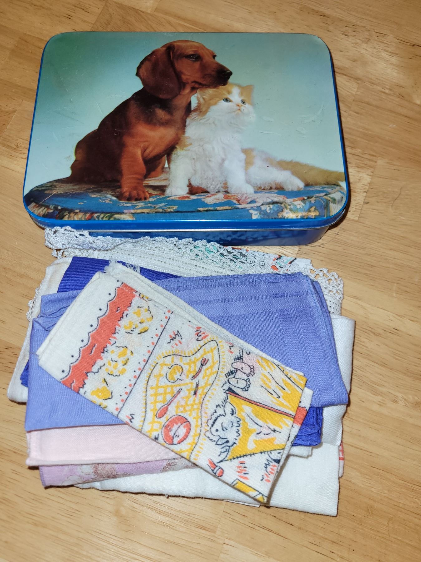 Vintage Bluebird Confectionary Tin with 1940s/1950s Napkins Hankies